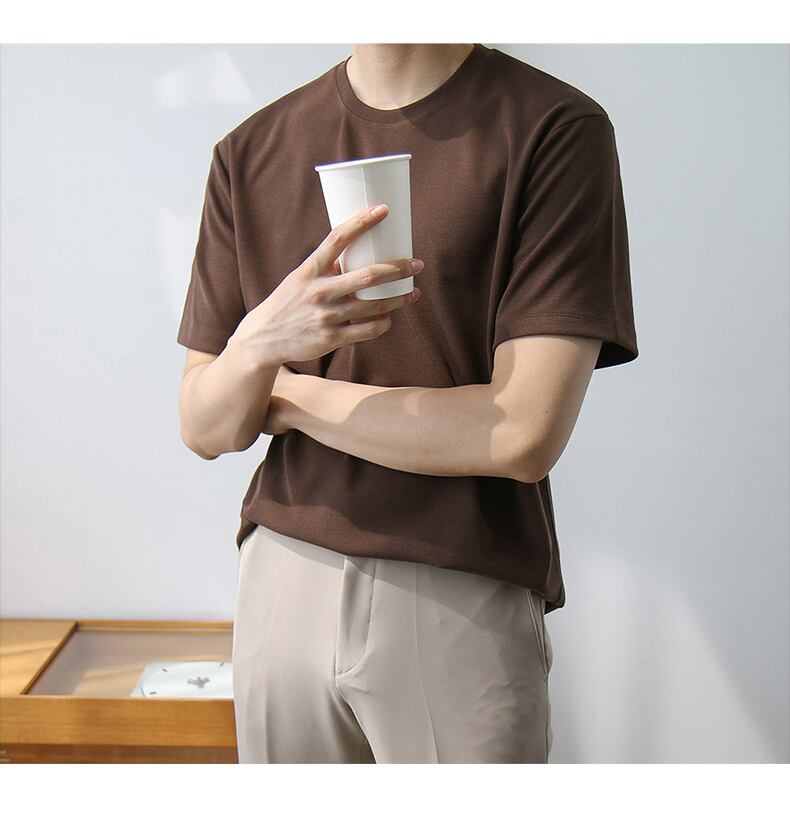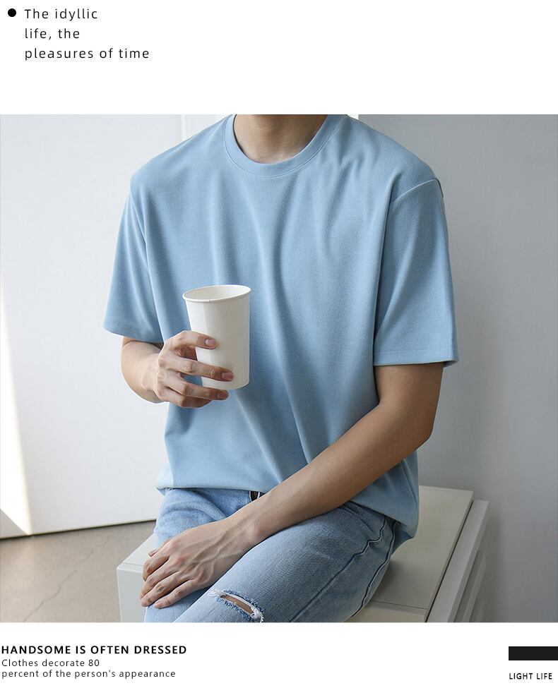 香港スタイルの半袖メンズコットン無地バージョンルーズでシンプルなオールマッチラウンドネック半袖eseレトロTシャツトップ Oネック ソリッドカラー BLUU36887298336