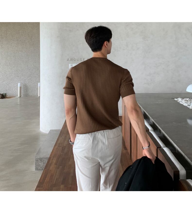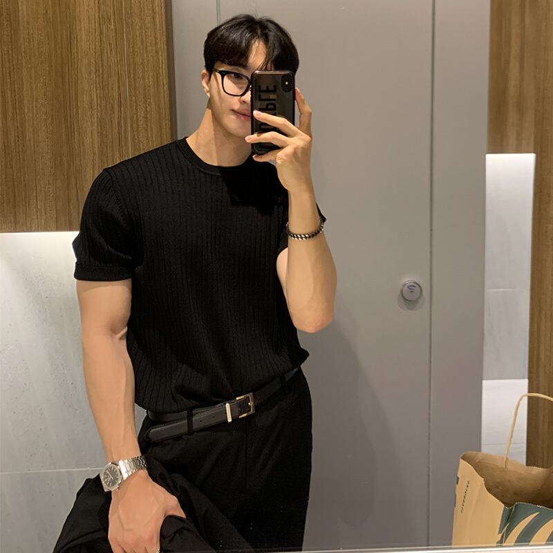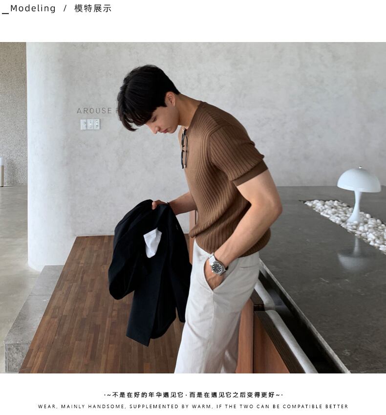 ラウンドネック半袖Tシャツメンズタイドブランドルーズサマー薄片香港スタイルカジュアル無地ニットセーター半袖Tシャツ 夏物 Oネック ソリッドカラー BLUU64590756967