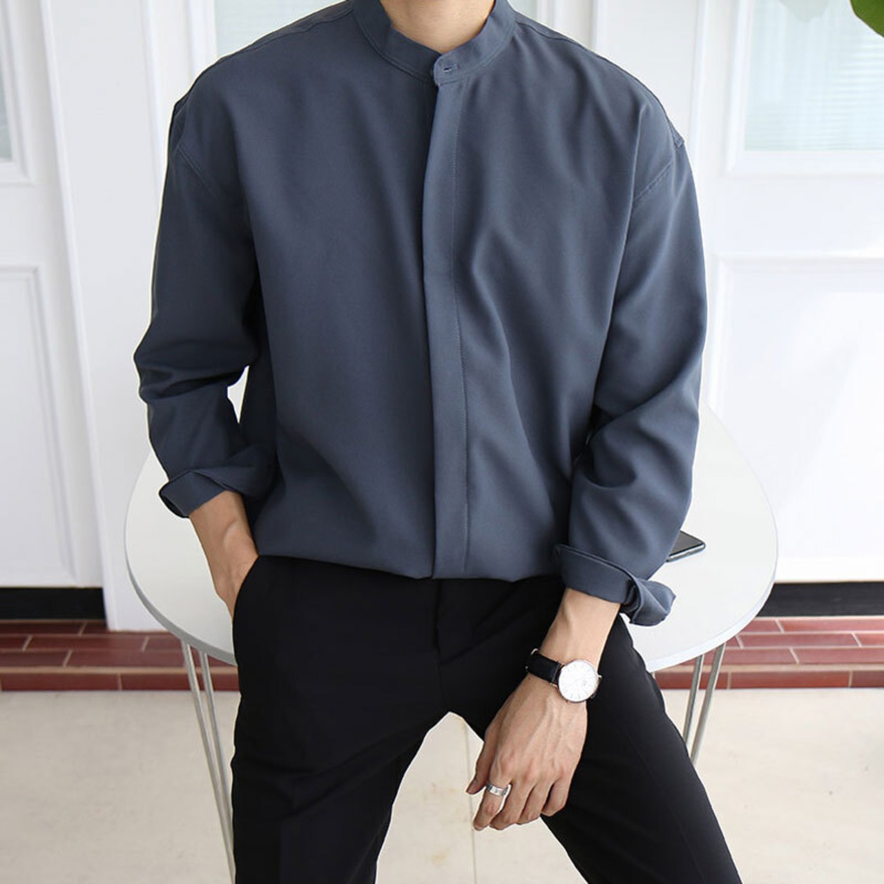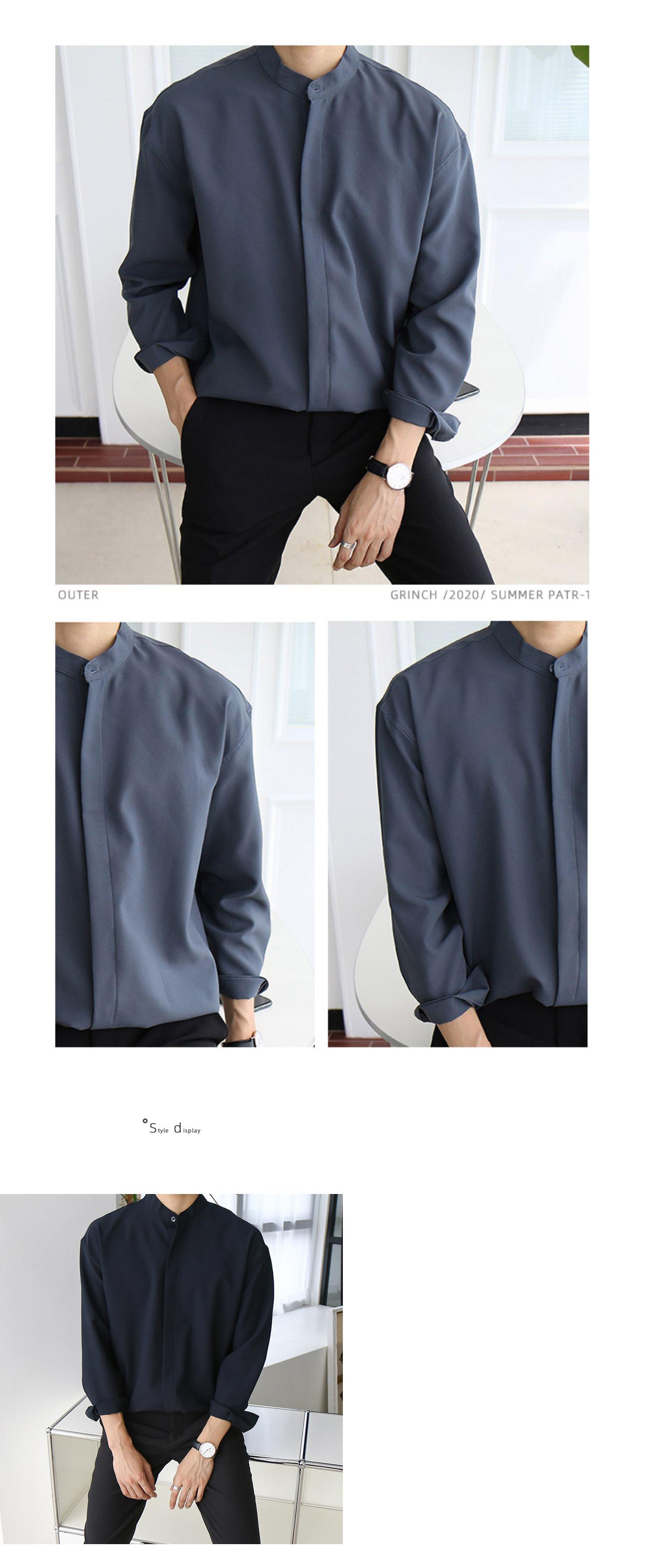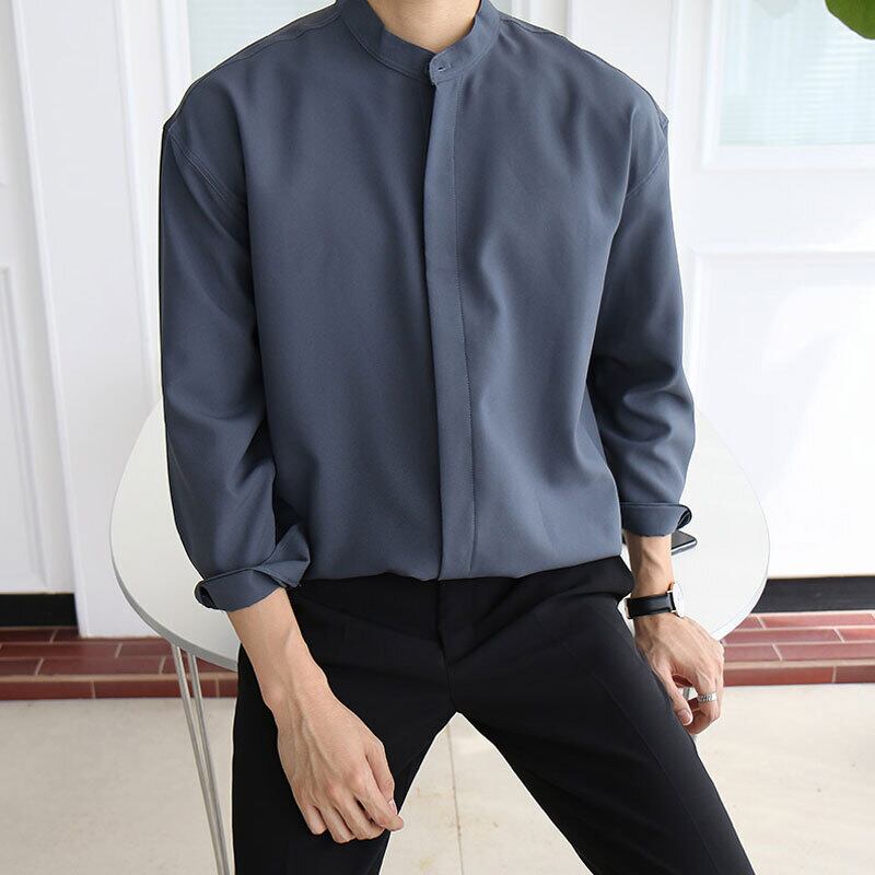 インターネットセレブInsシャツメンズサマーのユースバージョン新しいレトロな無地のスタンドアップカラー長袖シャツメンズトレンドシャツ ロング 夏物 ソリッドカラー BLUU13088786434