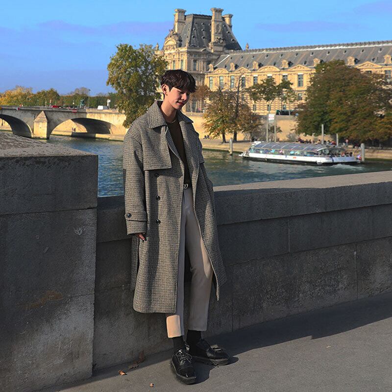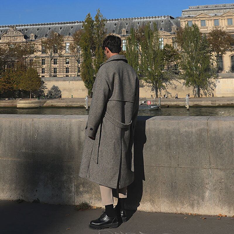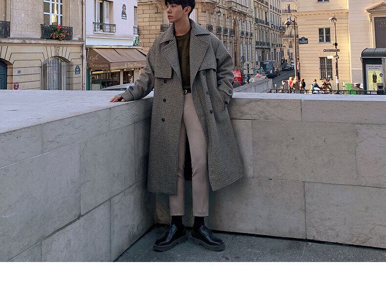 ウィンターコートメンズミドル丈千鳥格子チェックウールコートメンズウールイギリスウインドブレーカートレンド両面ウール 冬物 BLUU90819944448
