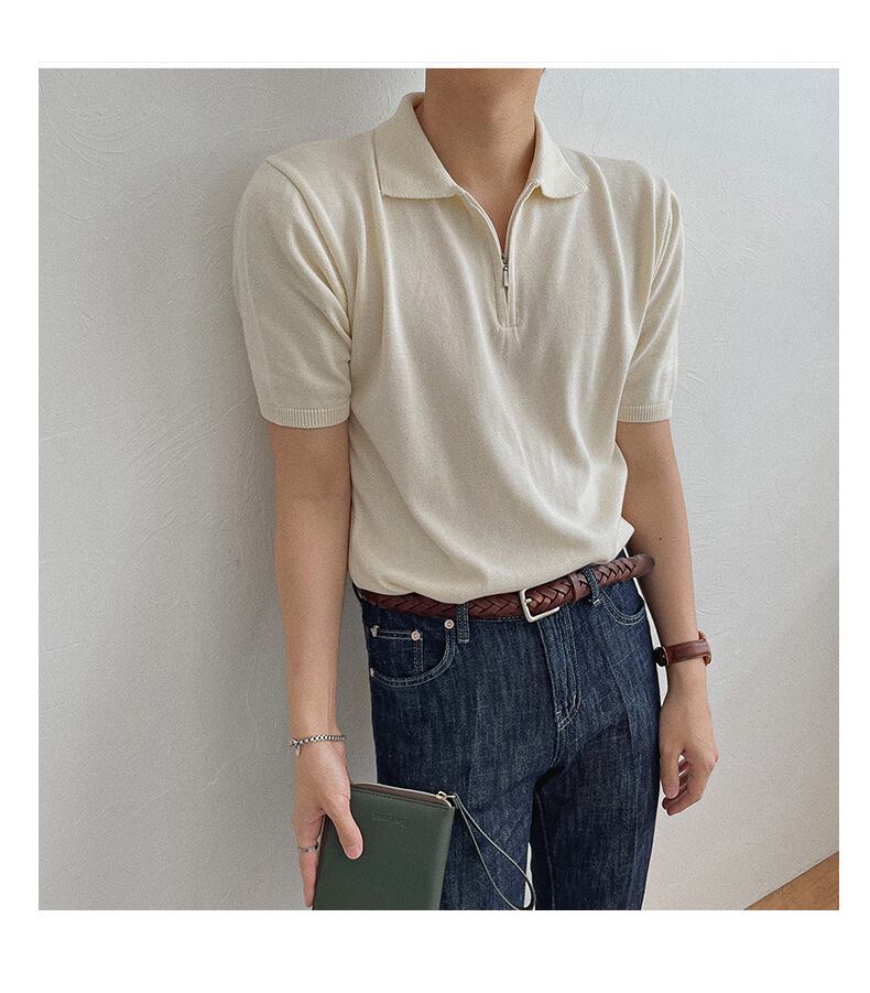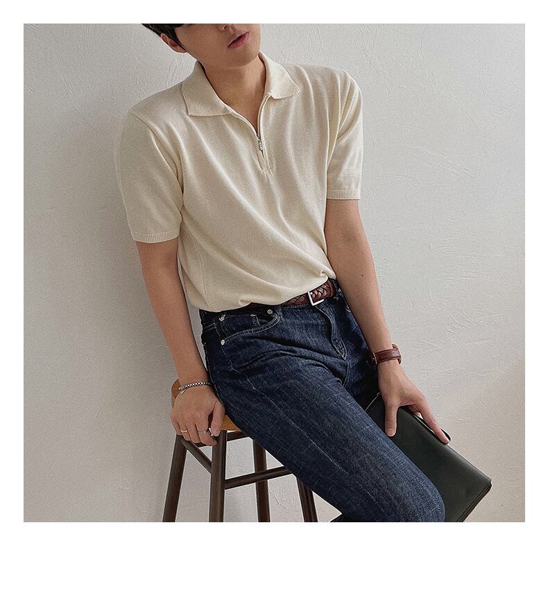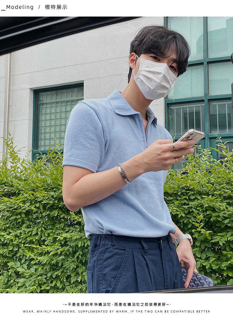 夏の薄手のポロシャツメンズジッパー半袖タイドブランドルーズでシンプルなオールマッチ無地ニットセーターTシャツ半袖 サマー 夏物 ソリッドカラー BLUU39679166007