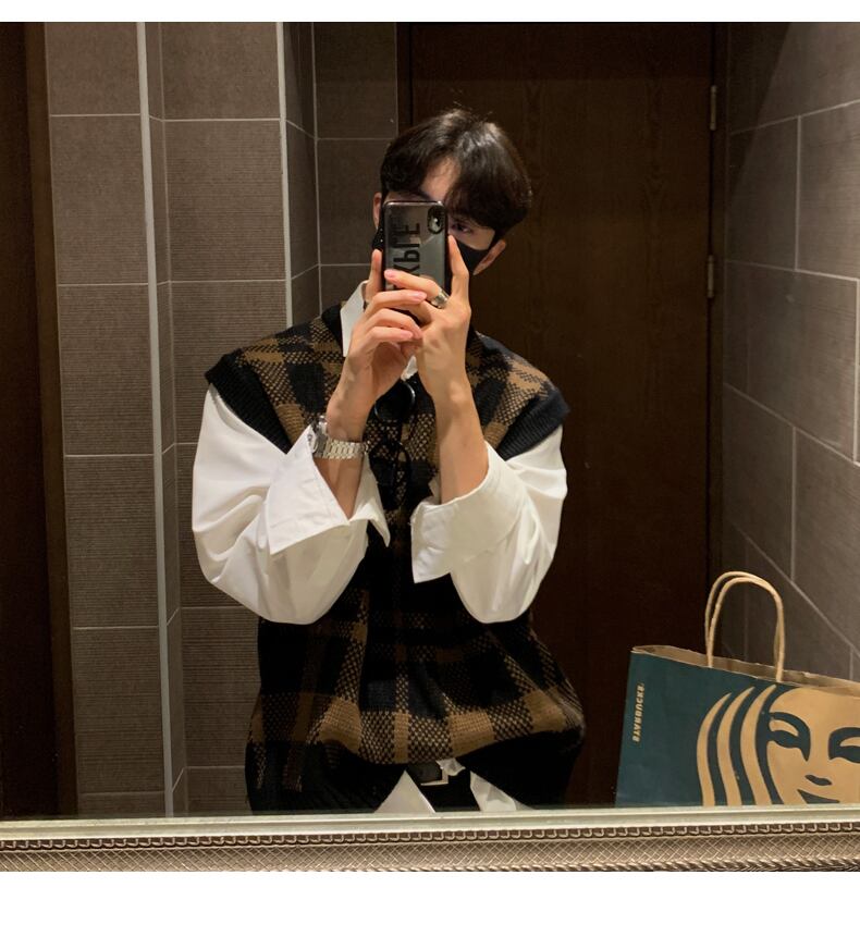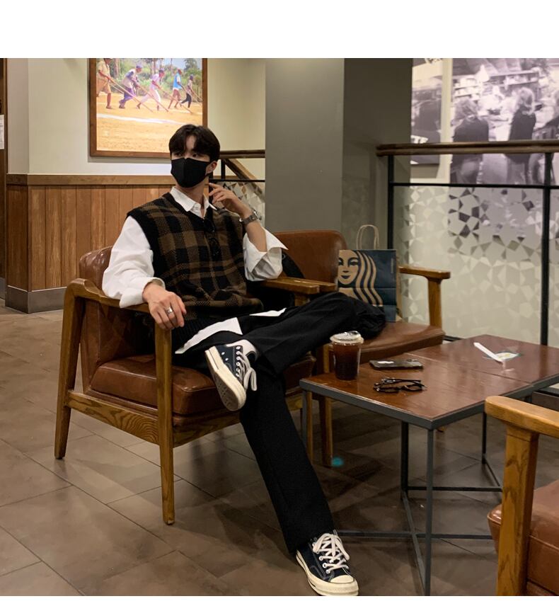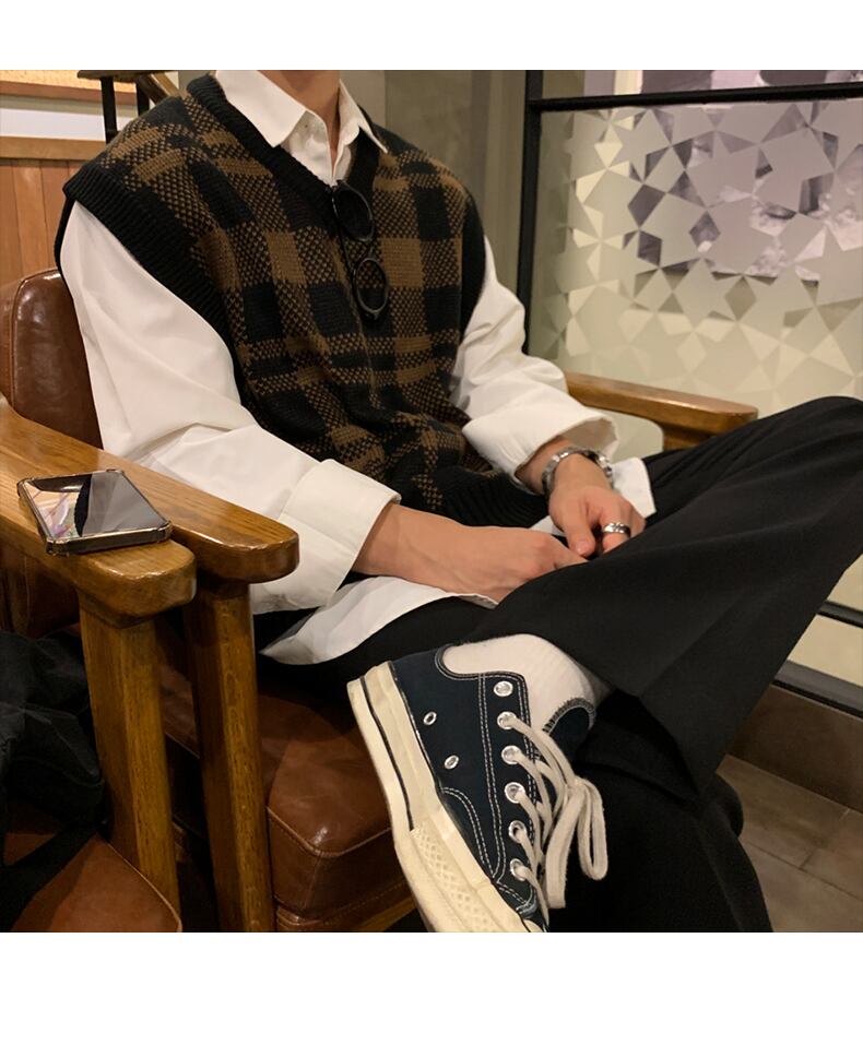 秋の新しい香港スタイルのレトロなノースリーブベストセーターメンズルーズカジュアルVネックセーターベストベストジャケット オータム 秋物 BLUU26580195810