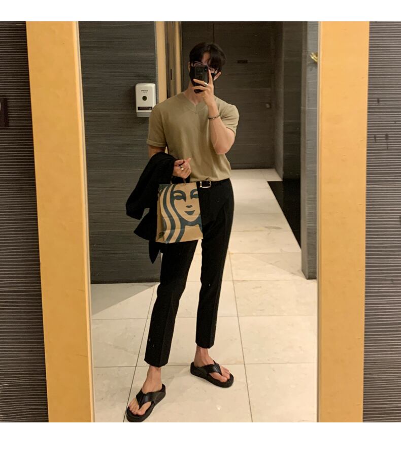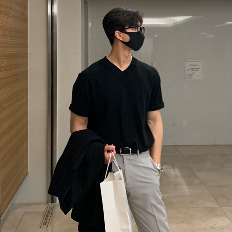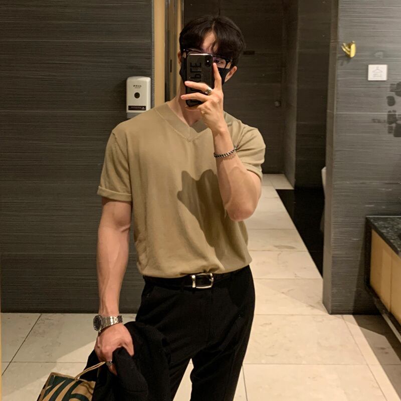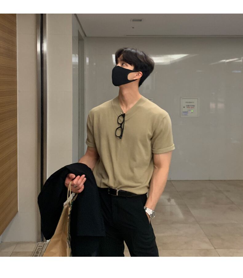 夏の薄手のVネック半袖Tシャツメンズルーズバージョンのカジュアルな香港スタイルのオールマッチ無地ニットセーター半袖Tシャツタイド サマー 夏物 ソリッドカラー BLUU39608995425
