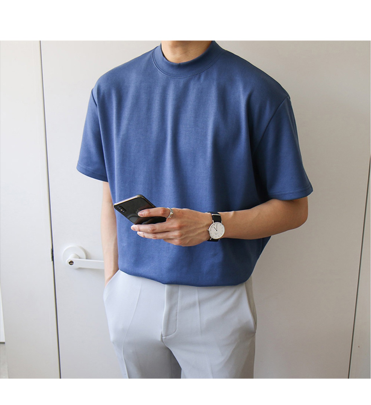 夏の新作ハーフハイネック半袖メンズタイドブランドバージョンルーズオールマッチ無地半袖Tシャツボトミングシャツトップス サマー 夏物 ソリッドカラー BLUU95031486018