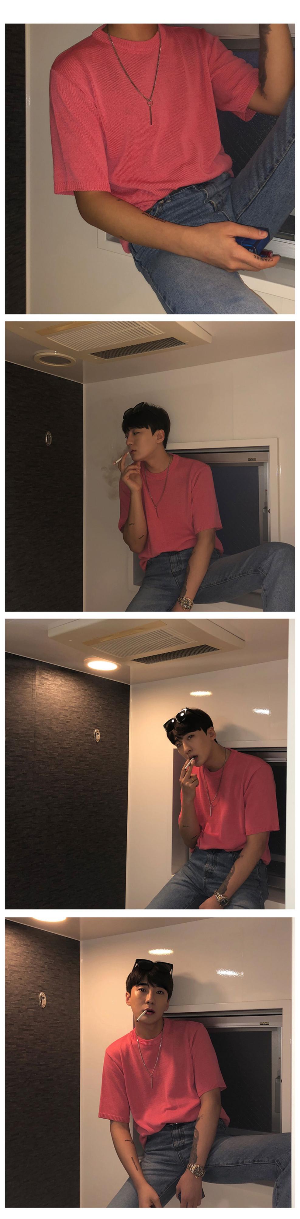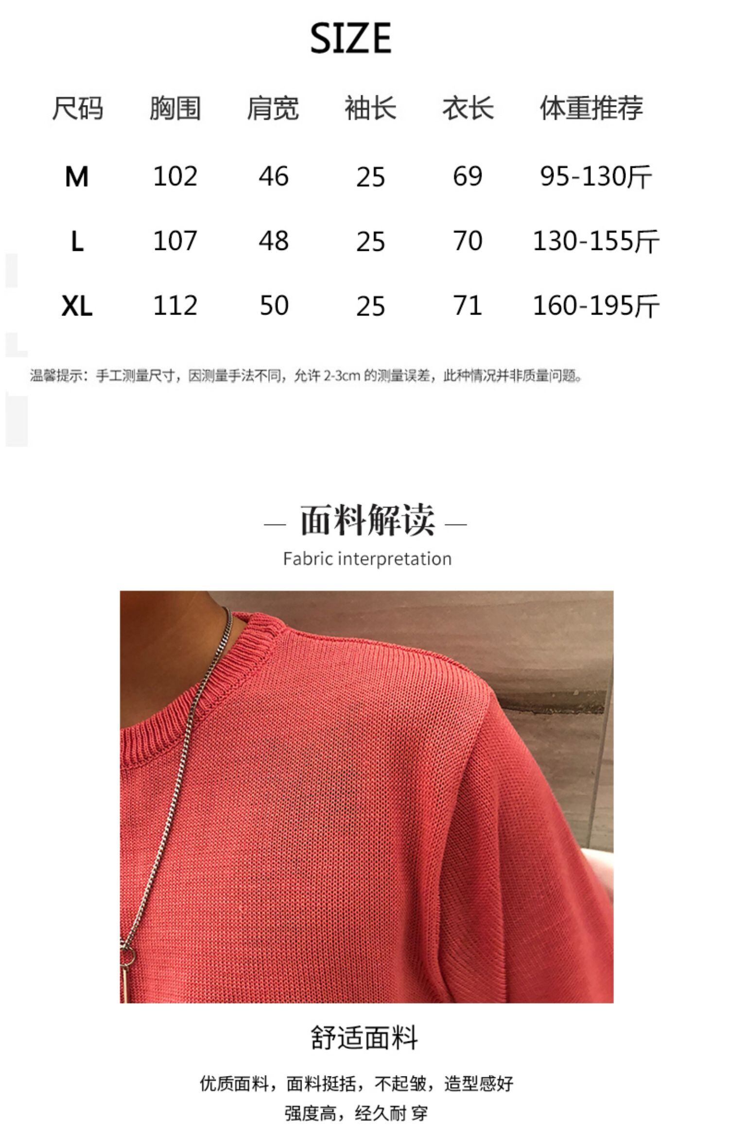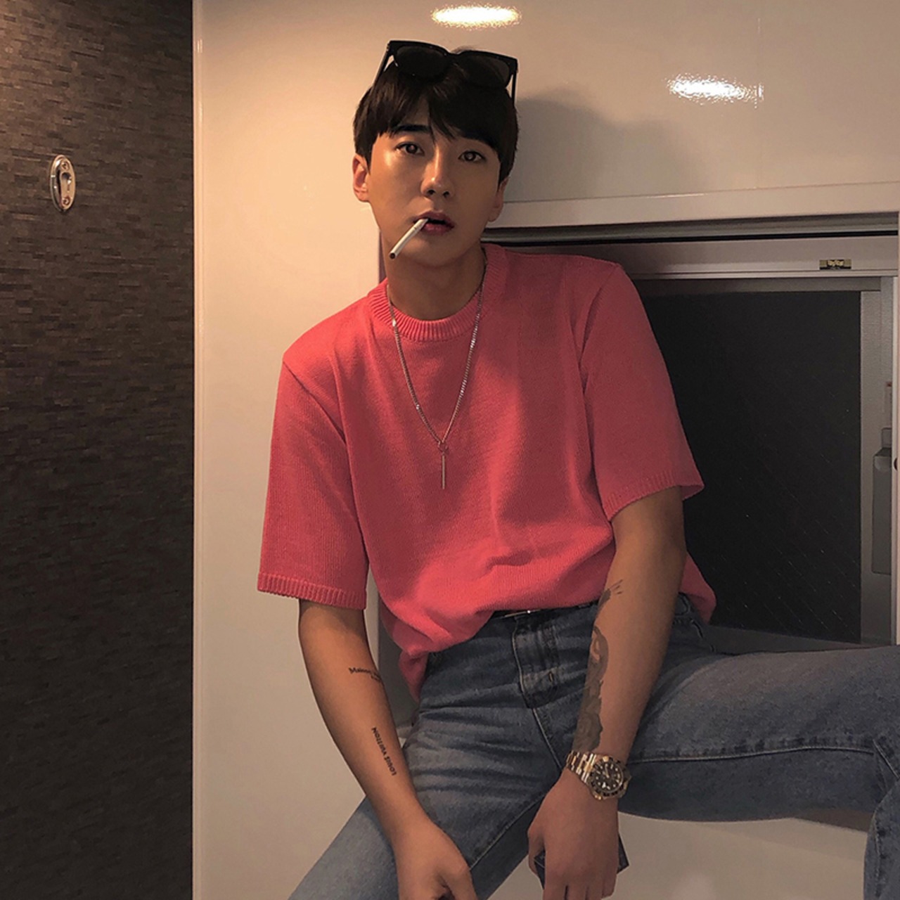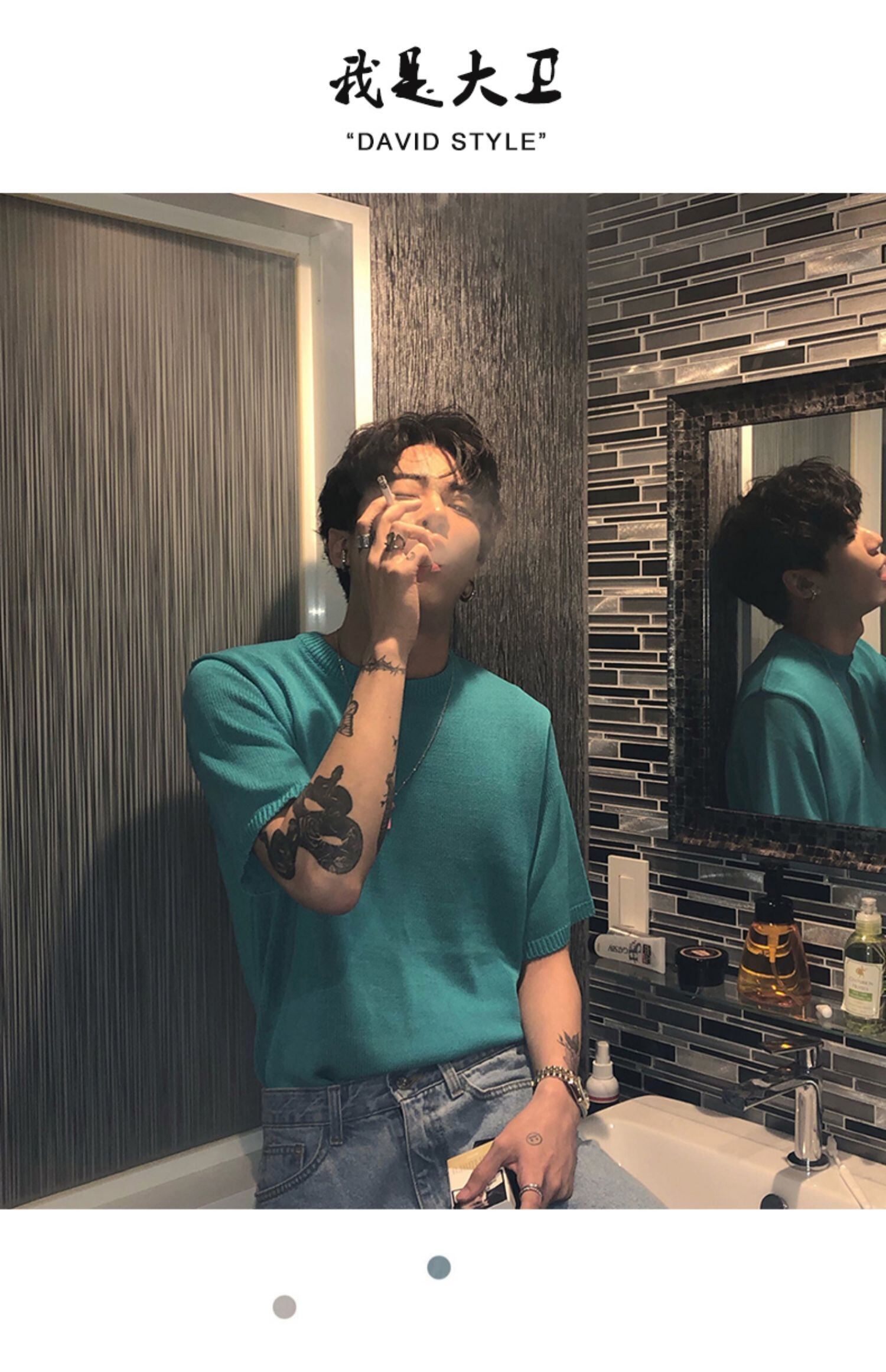 夏のTシャツメンズニットセーター半袖薄片トレンド服ルーズアイスシルク無地ラウンドネック香港スタイルTシャツ サマー 夏物 Oネック ソリッドカラー BLUU93834899467
