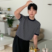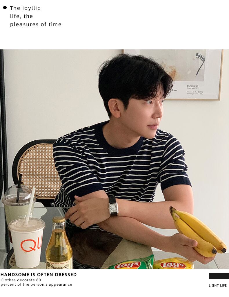 夏の薄手通気性ラウンドネック半袖Tシャツメンズルーズカジュアルバージョントレンドストライプニットセーター半袖トップス サマー 夏物 Oネック BLUU51353132762
