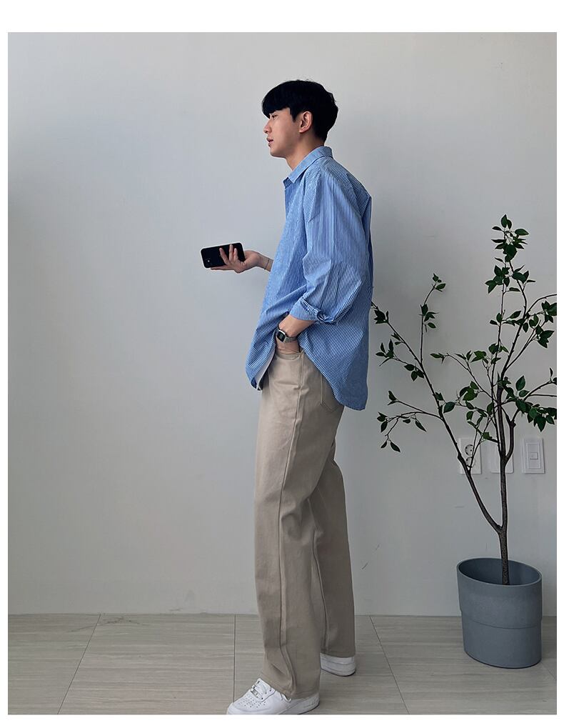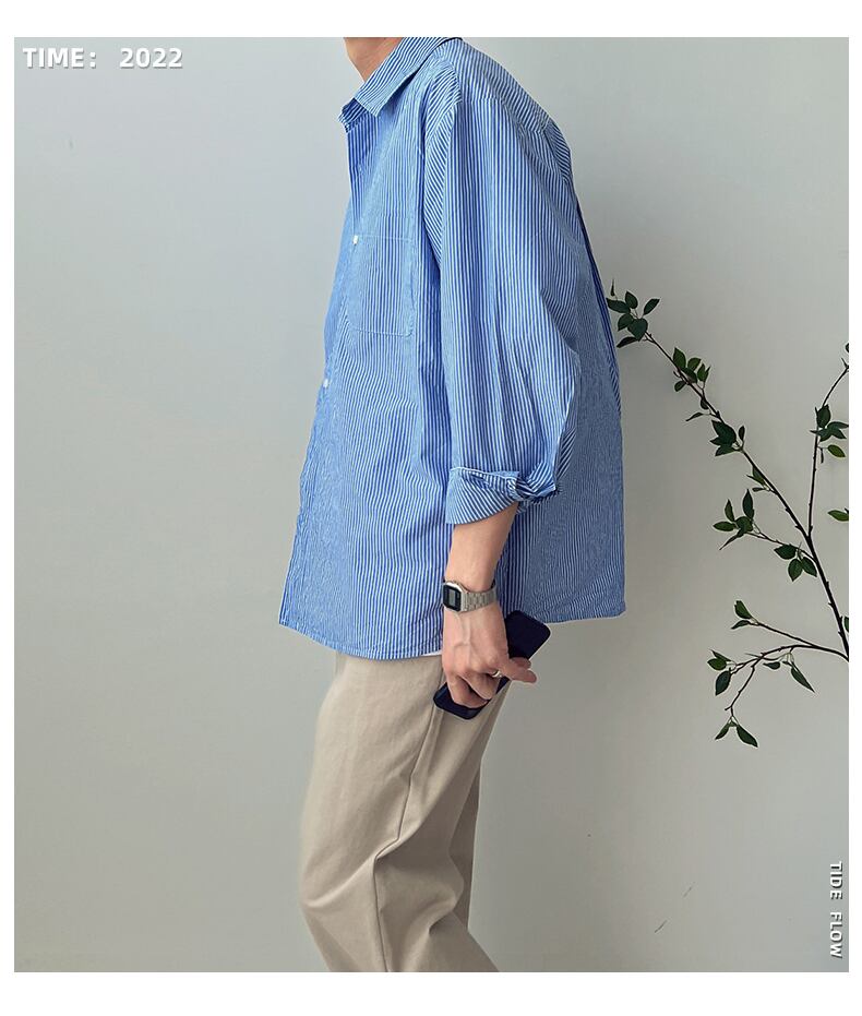 ストライプ長袖シャツメンズタイドブランドルーズオールマッチ香港スタイルeseカジュアルシャツバージョントレンドハイエンドインチシャツ ロング BLUU25700462908