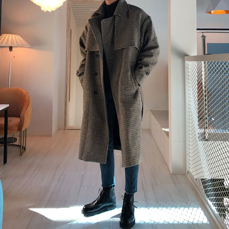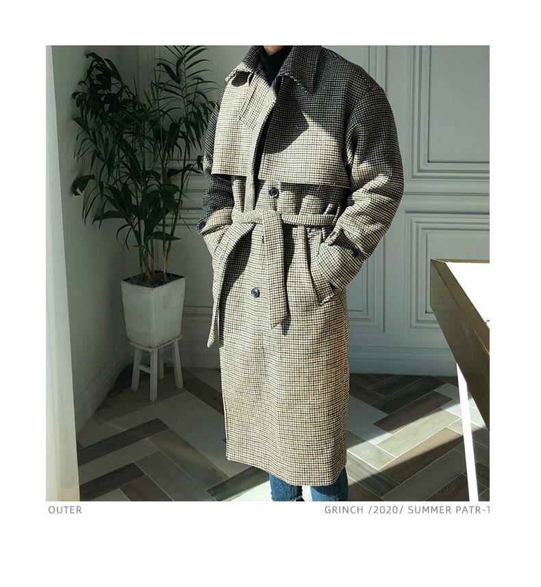 秋冬新作メンズミドル丈バージョン千鳥格子チェック柄ウールコートルーズブリティッシュスタイル両面ウインドブレーカー オータム 秋物 ウィンター 冬物 BLUU90317804384