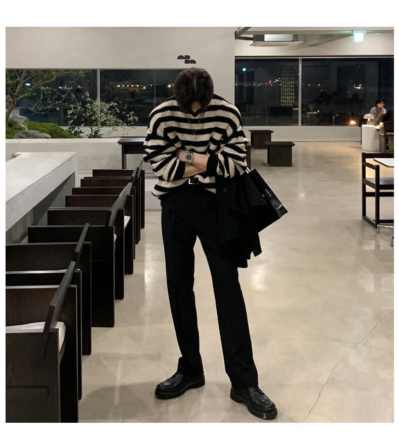 香港スタイルのレトロなラウンドネックセーターメンズタイドブランドルーズカジュアルトップバージョントレンドオールマッチストライプセータージャケット Oネック BLUU85022910213