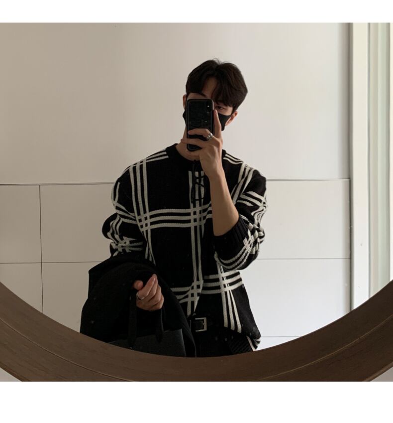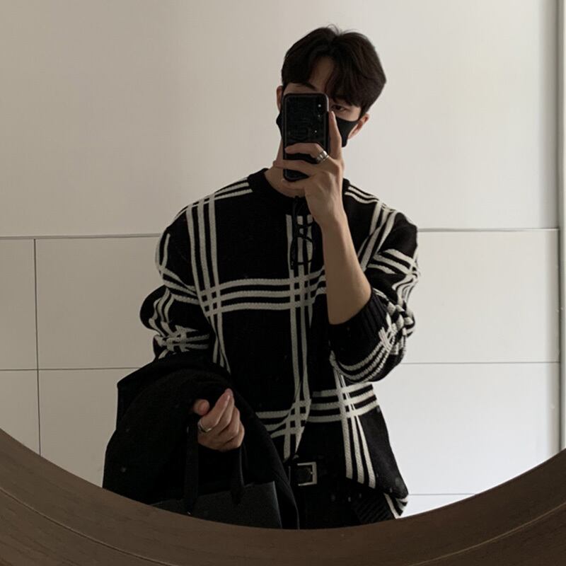 秋冬ラウンドネックセーターメンズ香港スタイルレトロカジュアルオールマッチチェック柄インナーボトムニットセータートップコート オータム 秋物 ウィンター 冬物 Oネック BLUU13380305462
