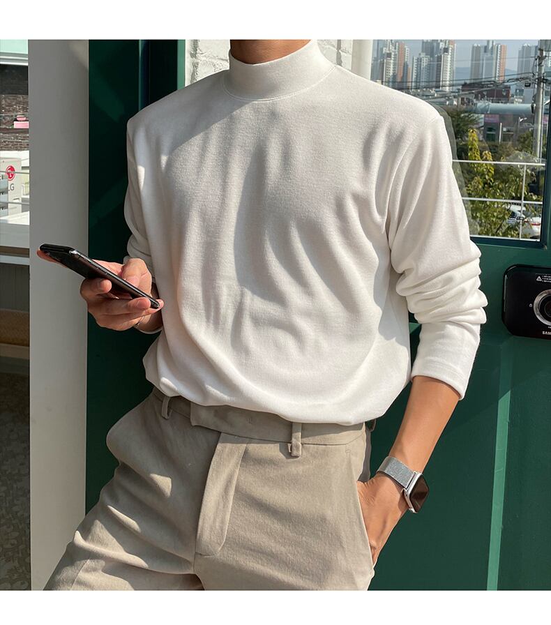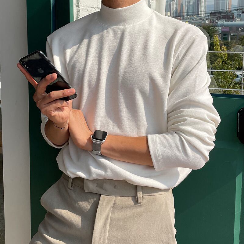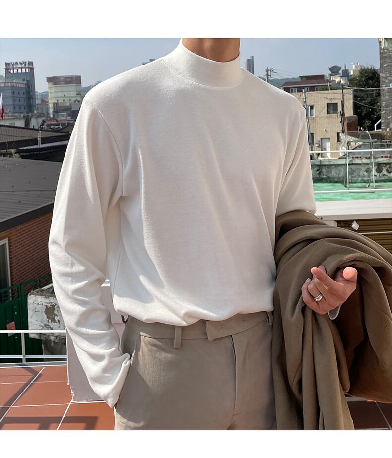 秋の新作ハーフハイカラー長袖Tシャツメンズピュアコットン香港スタイルトレンドオールマッチ無地インナーボトミングシャツトップス ロング オータム 秋物 ソリッドカラー BLUU54719452031