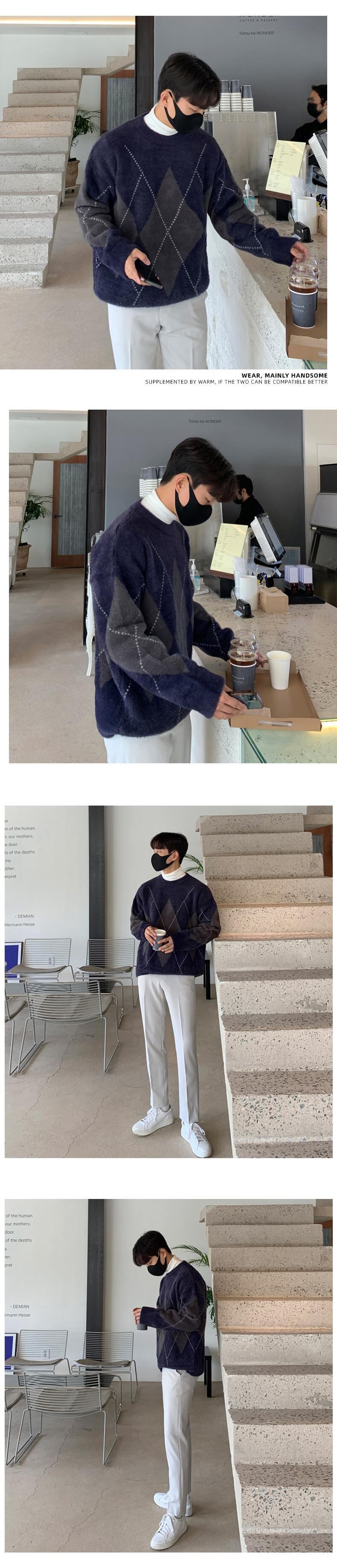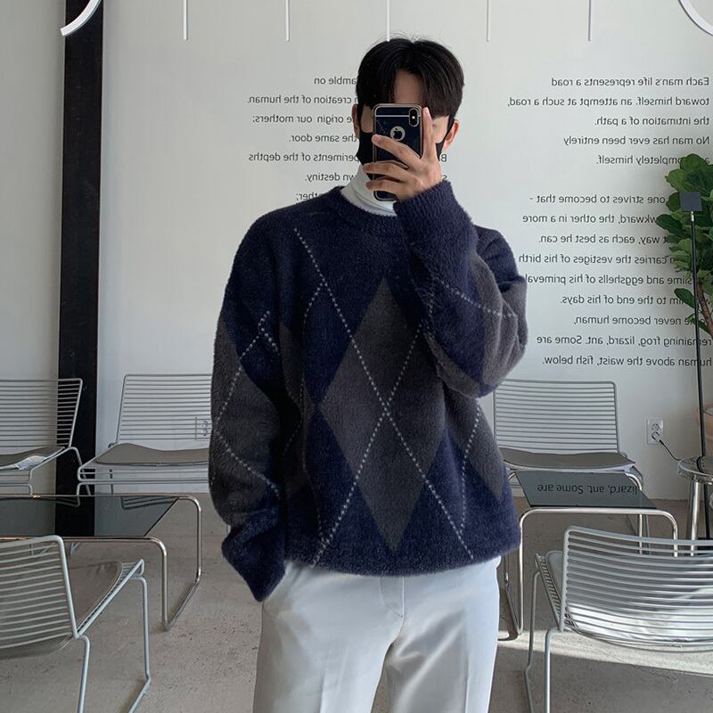 冬の厚みのあるダイヤモンドグリッドセーターメンズルーズカジュアル怠惰な風オールマッチラウンドネックプルオーバーニットセータートップコート ウィンター 冬物 Oネック BLUU75397946212