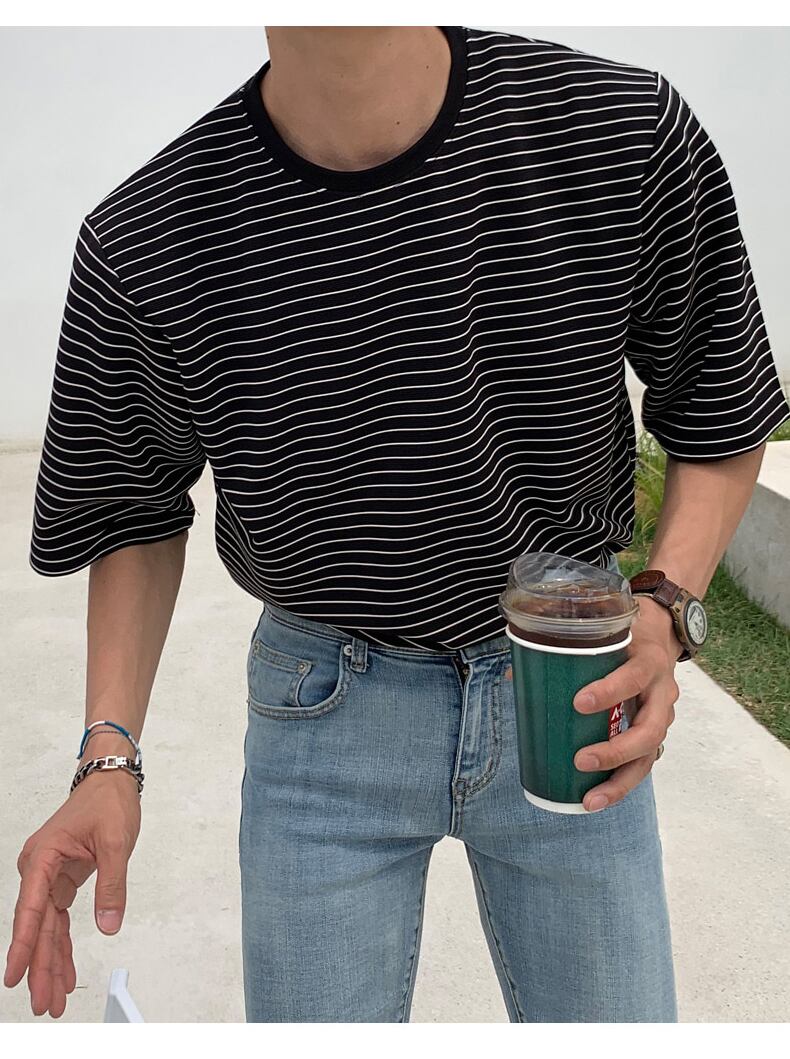 2022年夏の新作メンズ半袖服ピュアコットン香港スタイルルーズストライプTシャツトレンドルーズハーフスリーブオールマッチ サマー 夏物 BLUU27650152794