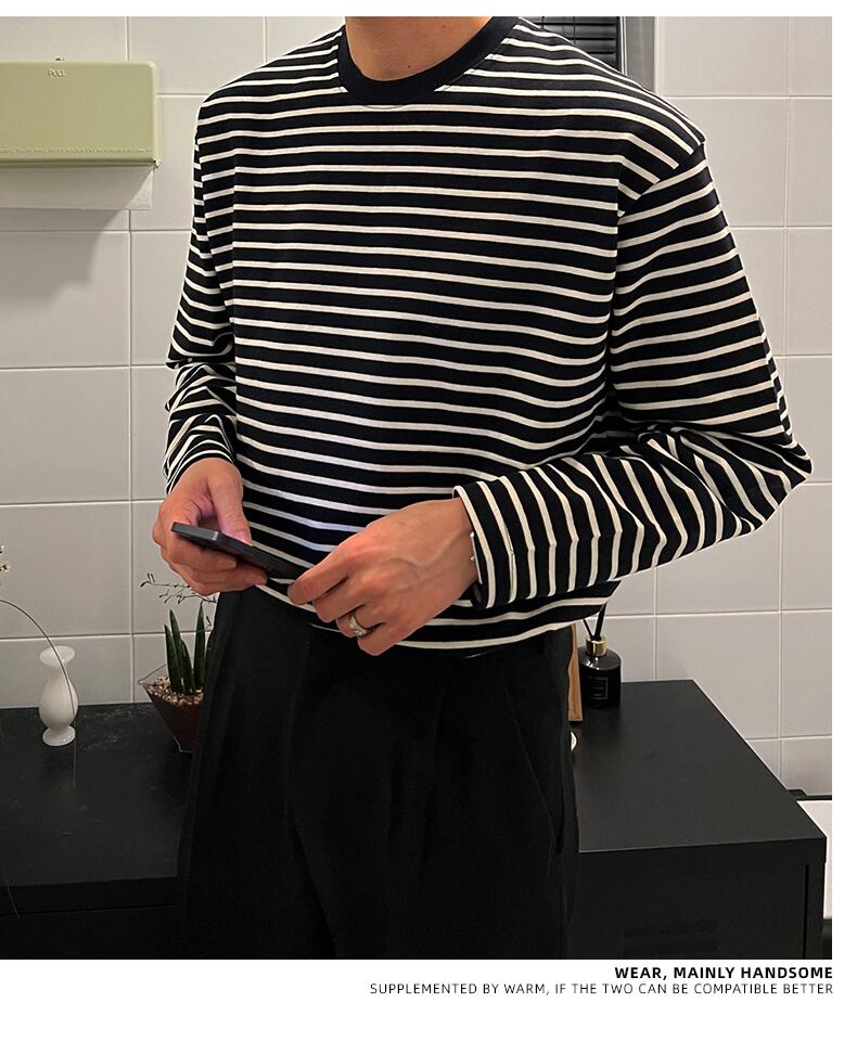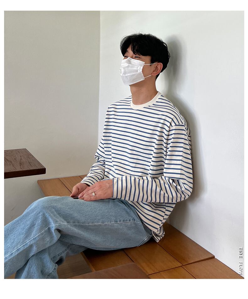 2022年春のストライプTシャツメンズ長袖タイドブランドトレンドインルーズ香港スタイルカジュアルオールマッチボトミングシャツトップス ロング スプリング 春物 BLUU85966065552