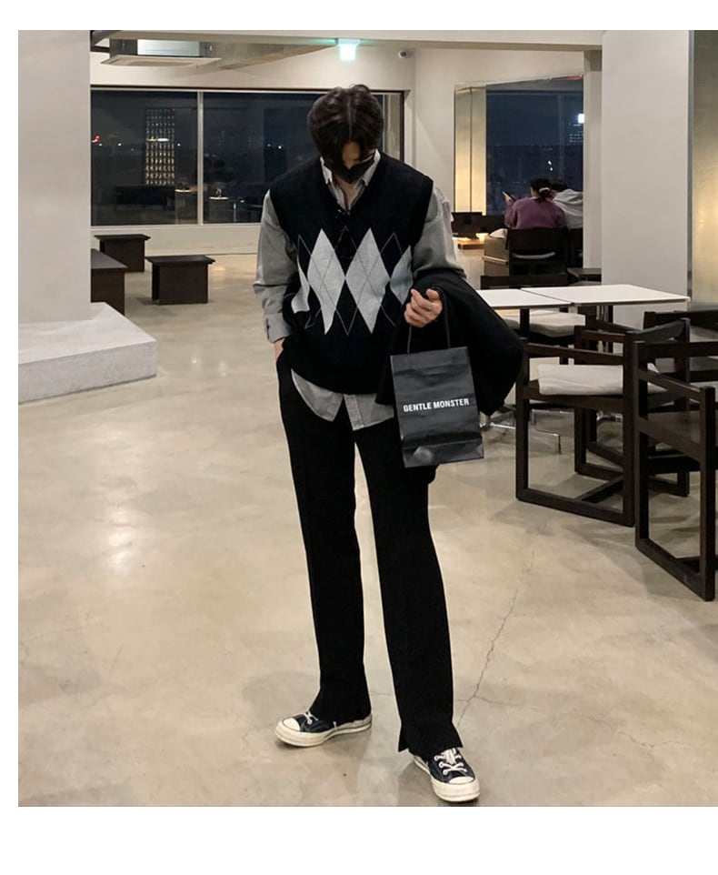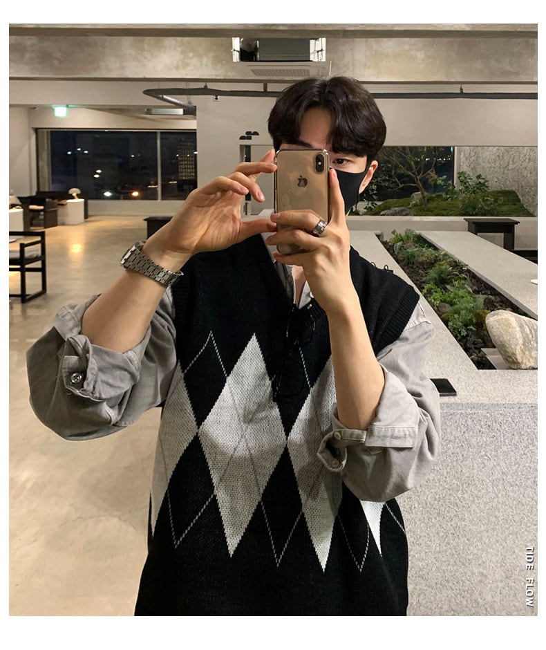 春のノースリーブベストVネックセーターメンズタイドルーズ香港スタイルダイヤモンドニットセーターベストベストジャケット スプリング 春物 BLUU1787191438