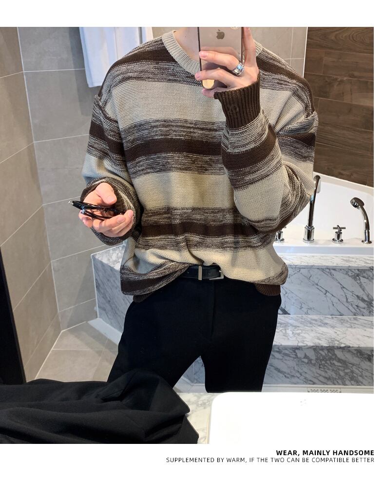 ラウンドネックストライプセーターメンズイントレンドルーズカジュアル怠惰な風プルオーバーセーター香港スタイルのセータージャケット Oネック BLUU89248484952
