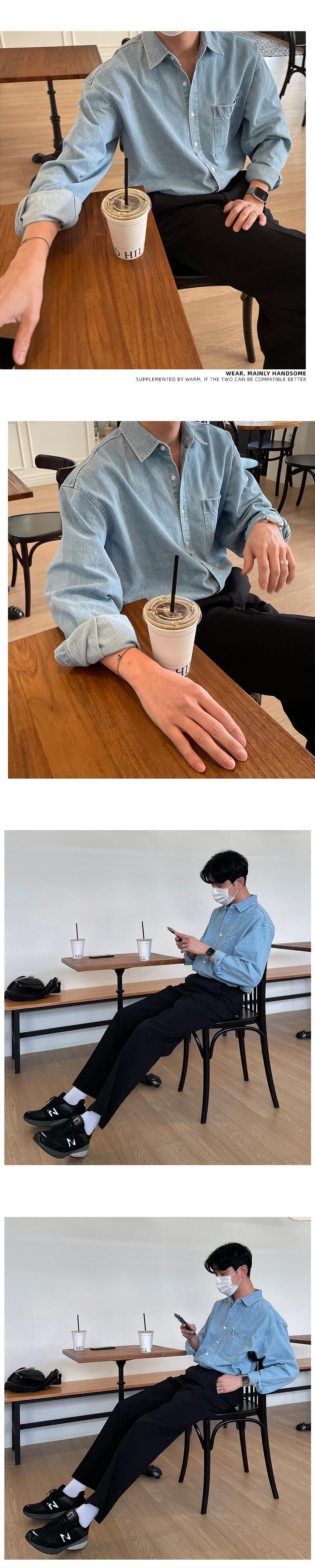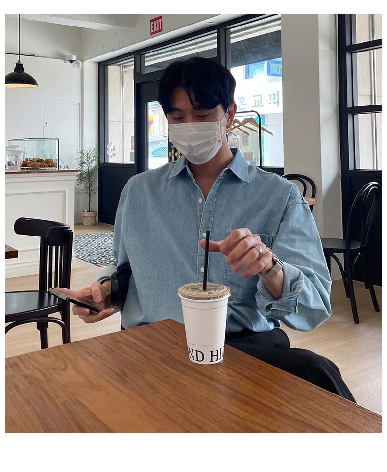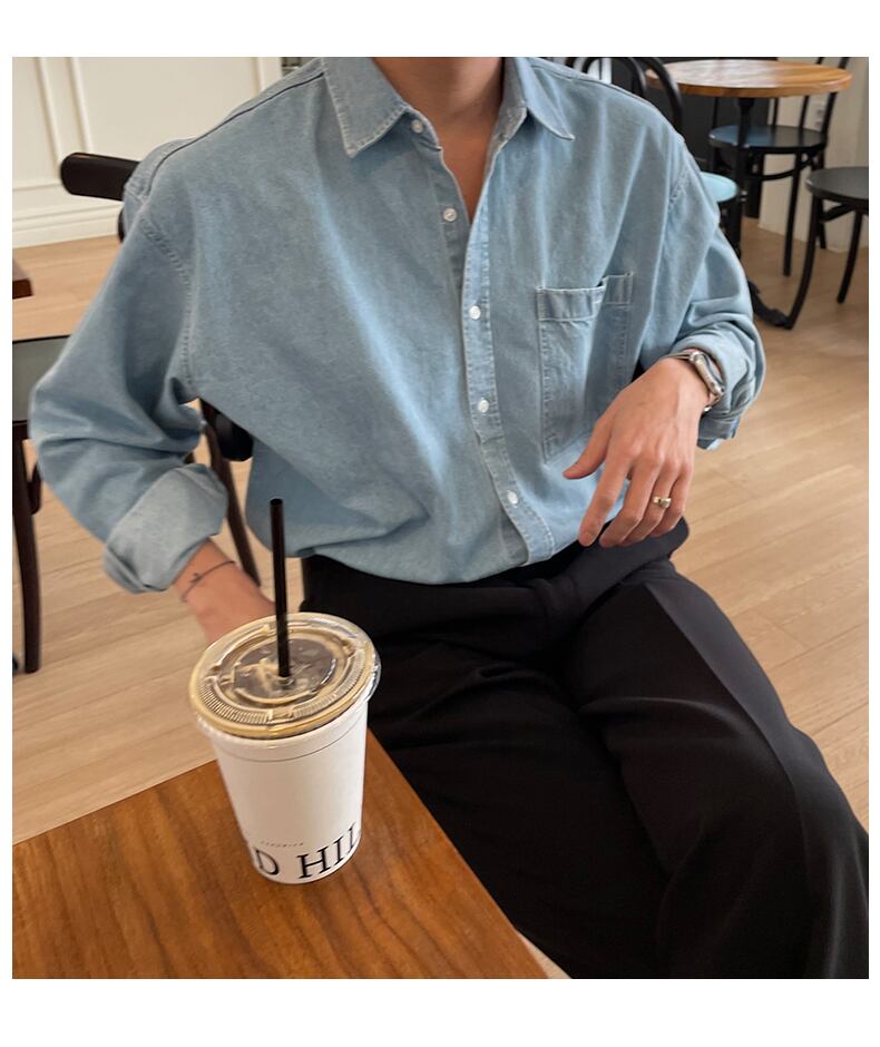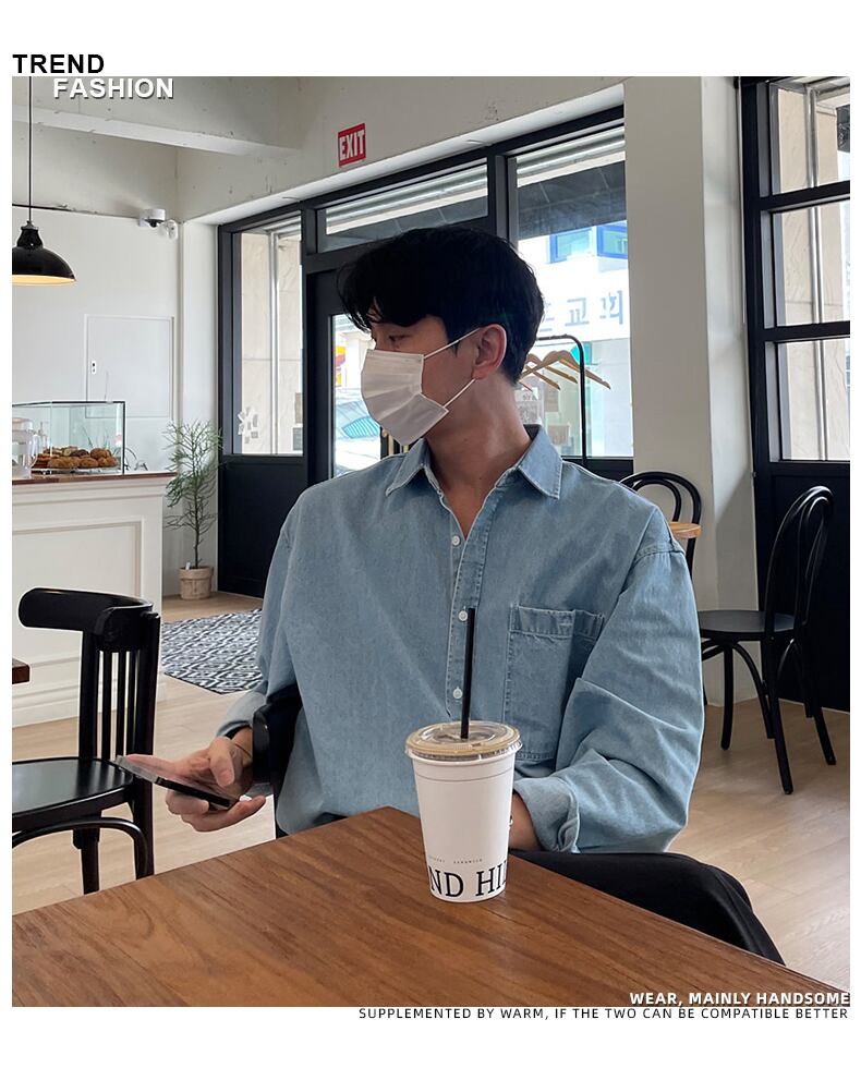 バージョントレンドライトブルーデニムシャツメンズ長袖タイドブランドルーズ無地香港スタイルオールマッチカジュアルシャツジャケット ロング ソリッドカラー BLUU4891983086