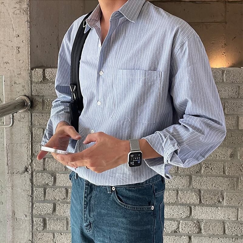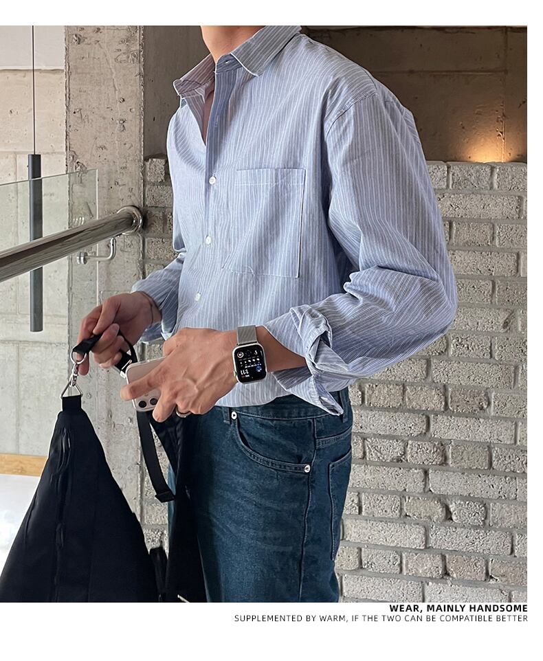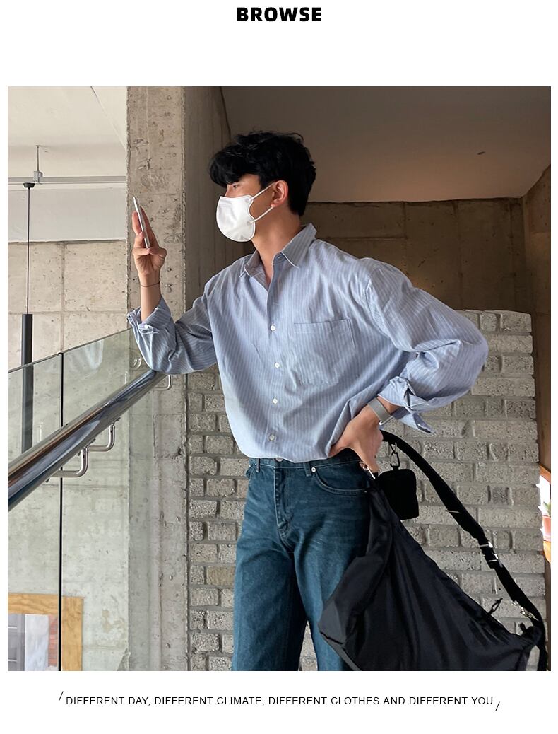 2022年ストライプシャツメンズ長袖タイドブランド香港スタイルルーズインチシャツワイルドバージョントレンドカジュアルシャツコート ロング BLUU97198492222