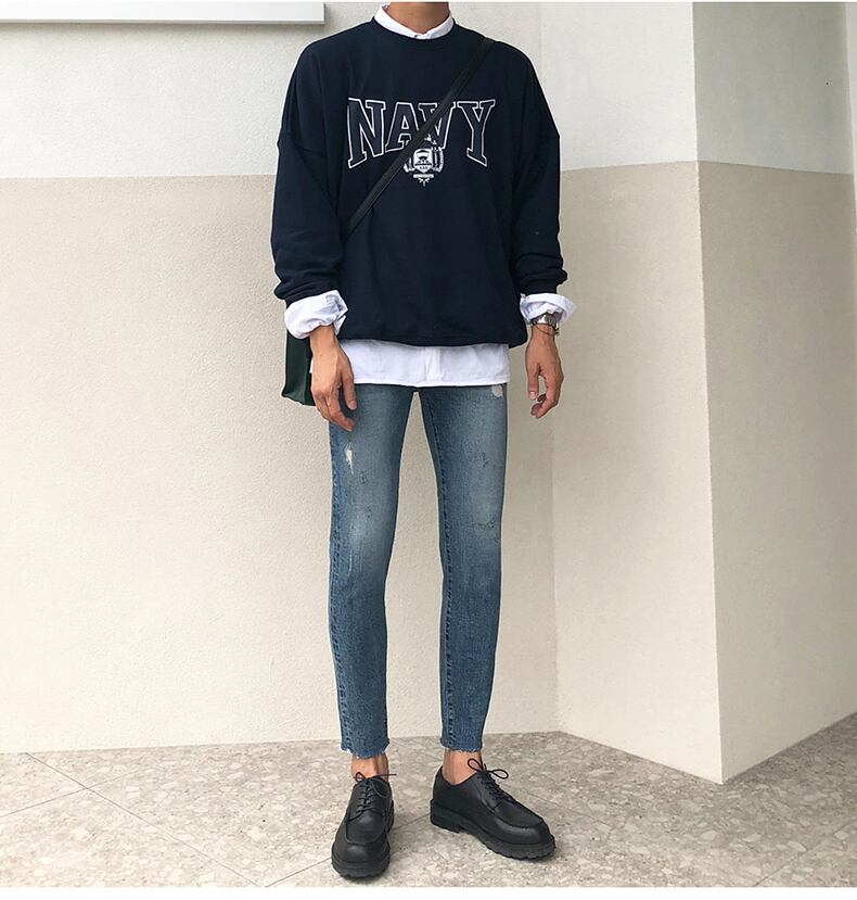 ラウンドネックセーターメンズトレンディなイン秋新しいルーズカジュアルプルオーバートップ香港スタイルオールマッチ無地Tシャツジャケット オータム 秋物 Oネック ソリッドカラー BLUU39143340412