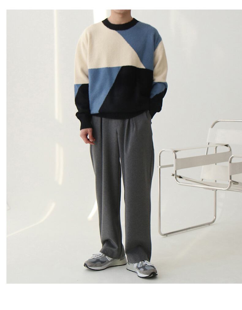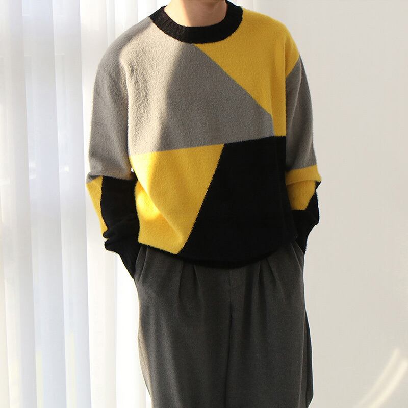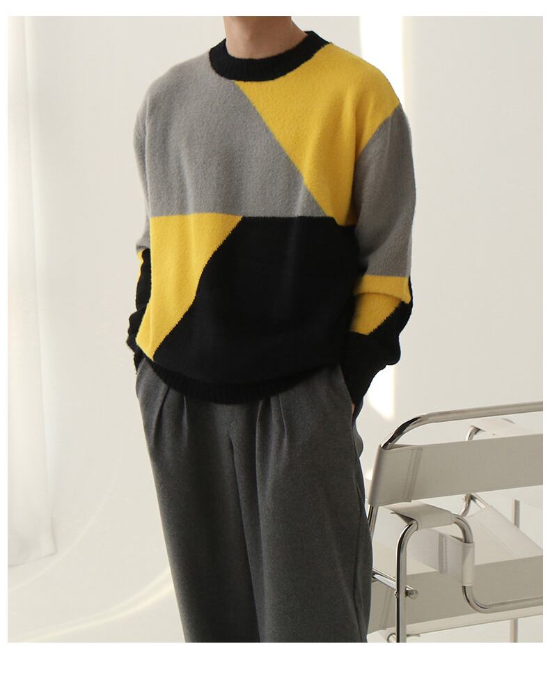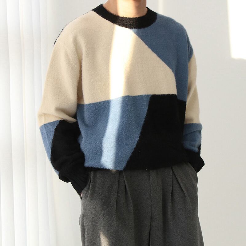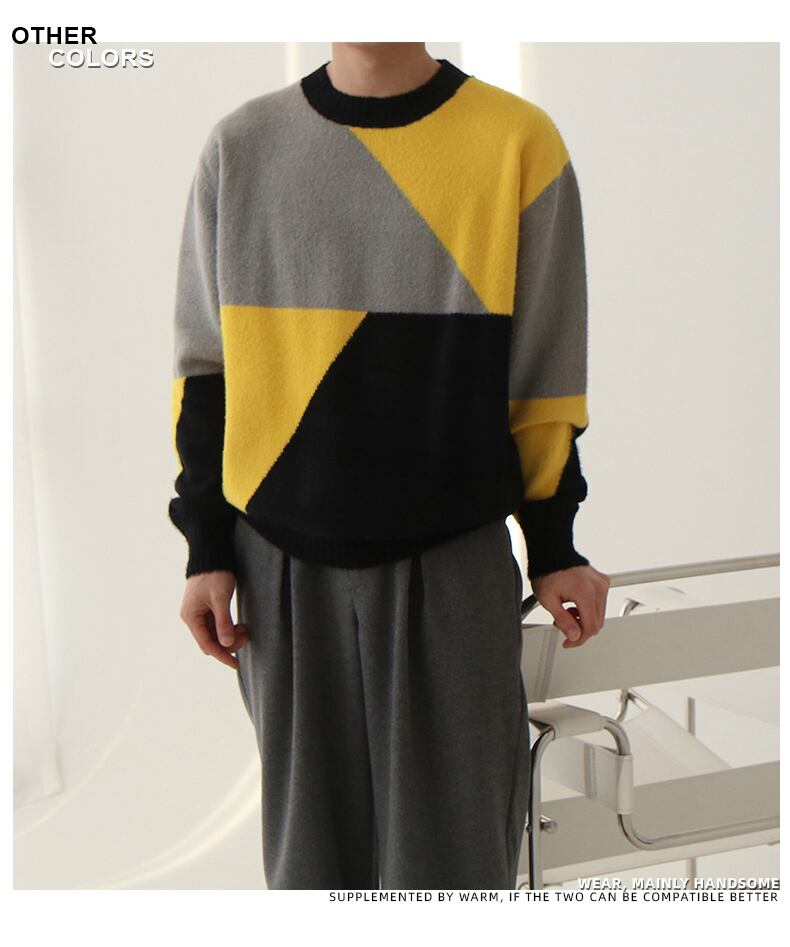 バージョンカラーブロッキングセーターメンズトレンディブランドルーズデザインスモールラウンドネックボトミングセーターカジュアルトップスオールマッチ Oネック BLUU79183508851