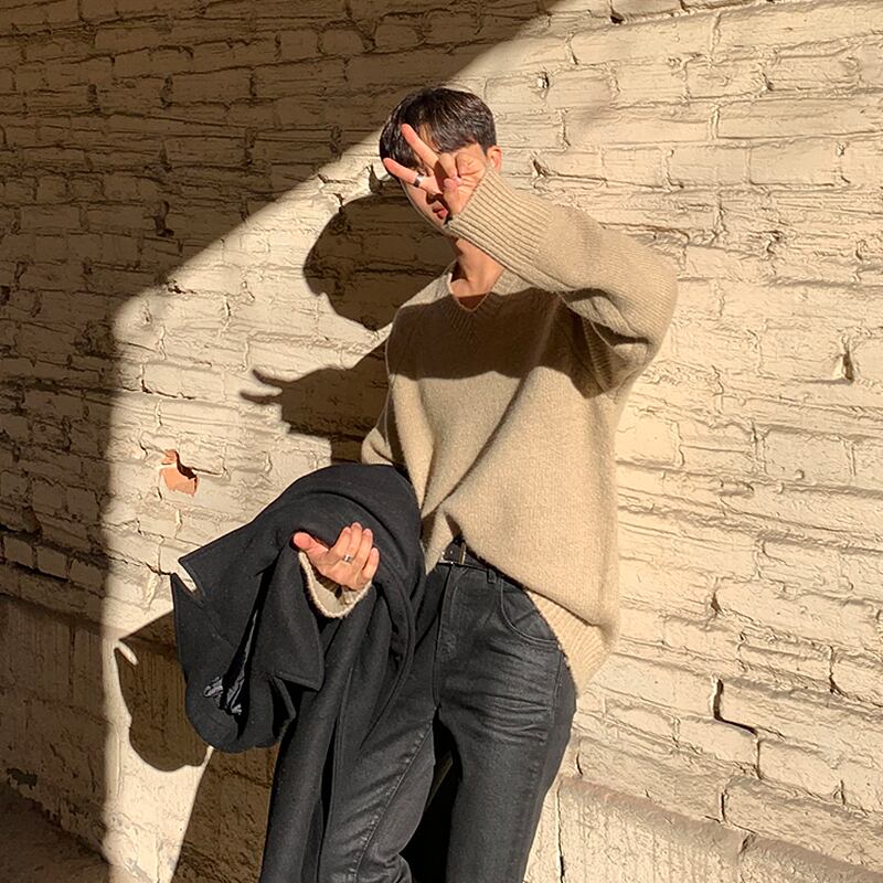 バージョンVネックセーターメンズルーズで怠惰なトレンドオールマッチ202春秋新作無地ニットセーターアウター スプリング 春物 オータム 秋物 ソリッドカラー BLUU39056781413