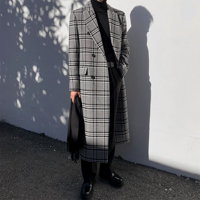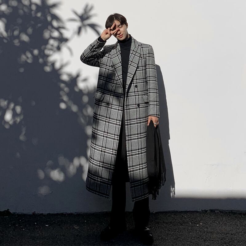 秋冬新作ウールコートメンズミドル丈オーバーザニーブリティッシュスタイルレトロバージョンルーズチェック柄ウールコート オータム 秋物 ウィンター 冬物 BLUU23251493480