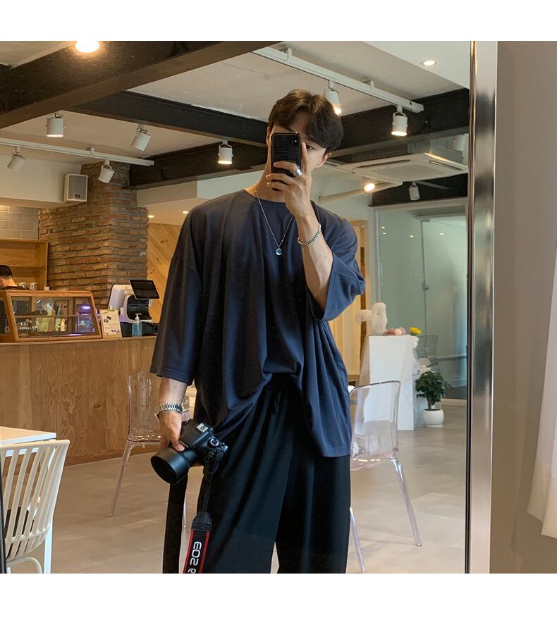 香港スタイルの半袖Tシャツメンズルーズバージョントレンドオールマッチカジュアル無地シンプル5点半袖トップTシャツ ソリッドカラー BLUU96364914307