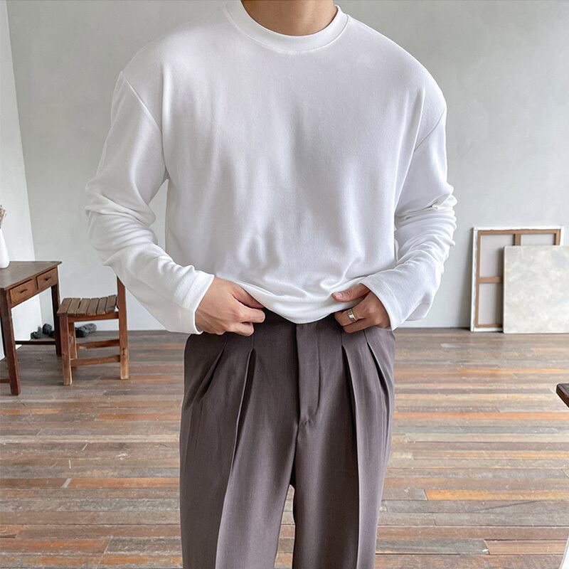 秋の新作長袖Tシャツメンズタイドブランド無地コットンルーズトレンド香港スタイルオールマッチボトミングシャツTシャツトップ ロング オータム 秋物 ソリッドカラー BLUU17019249400
