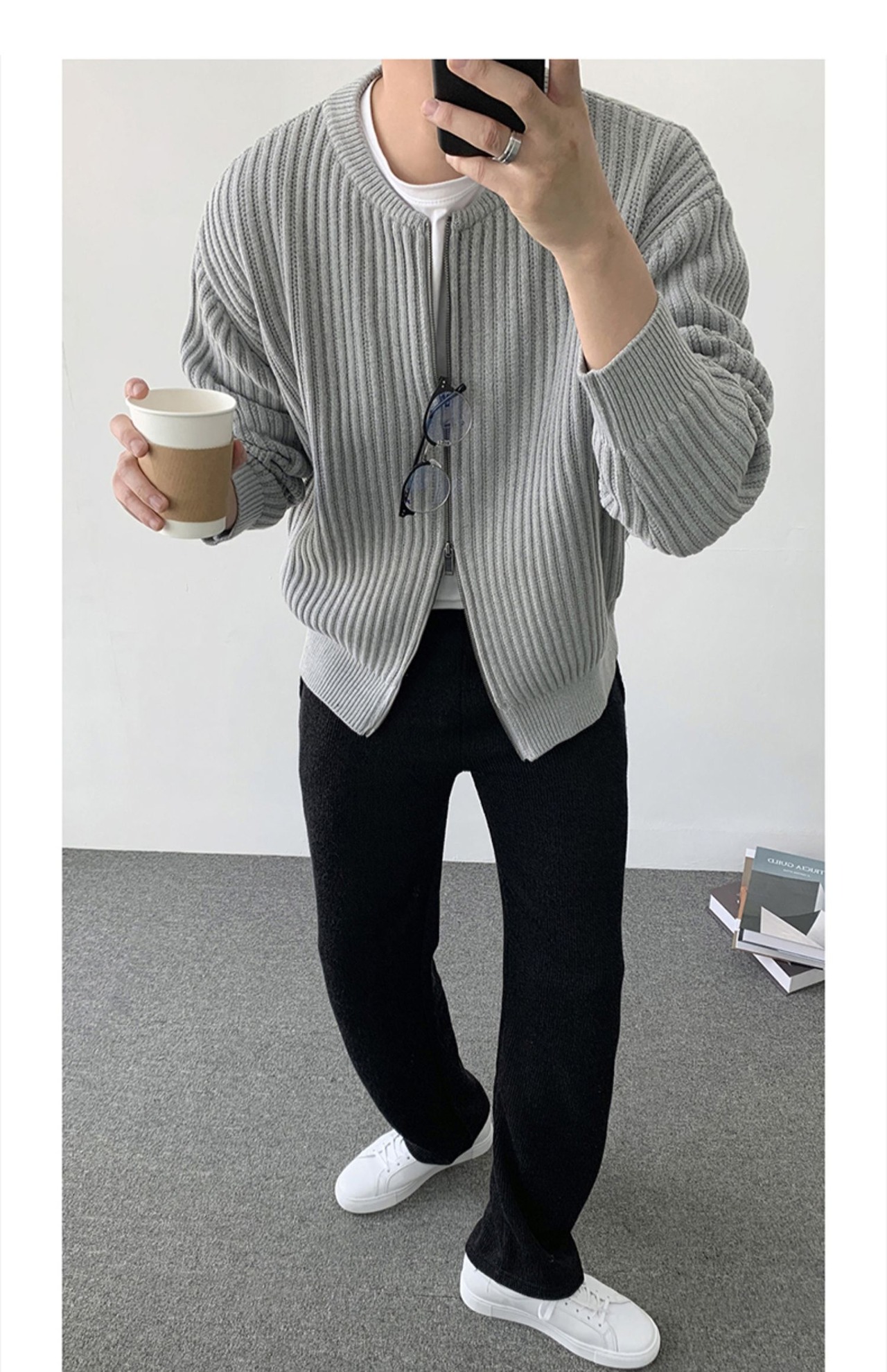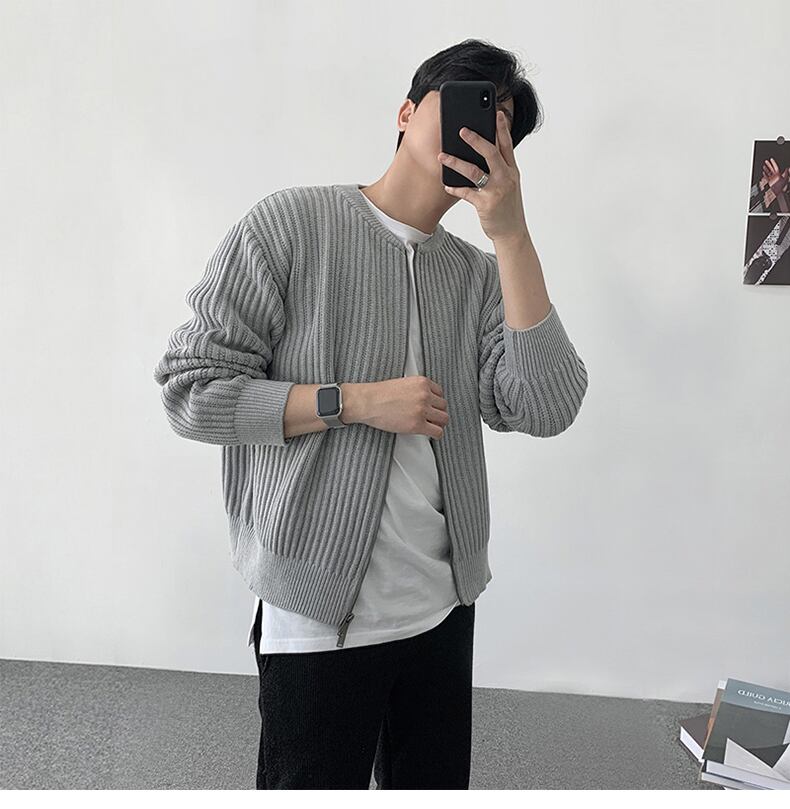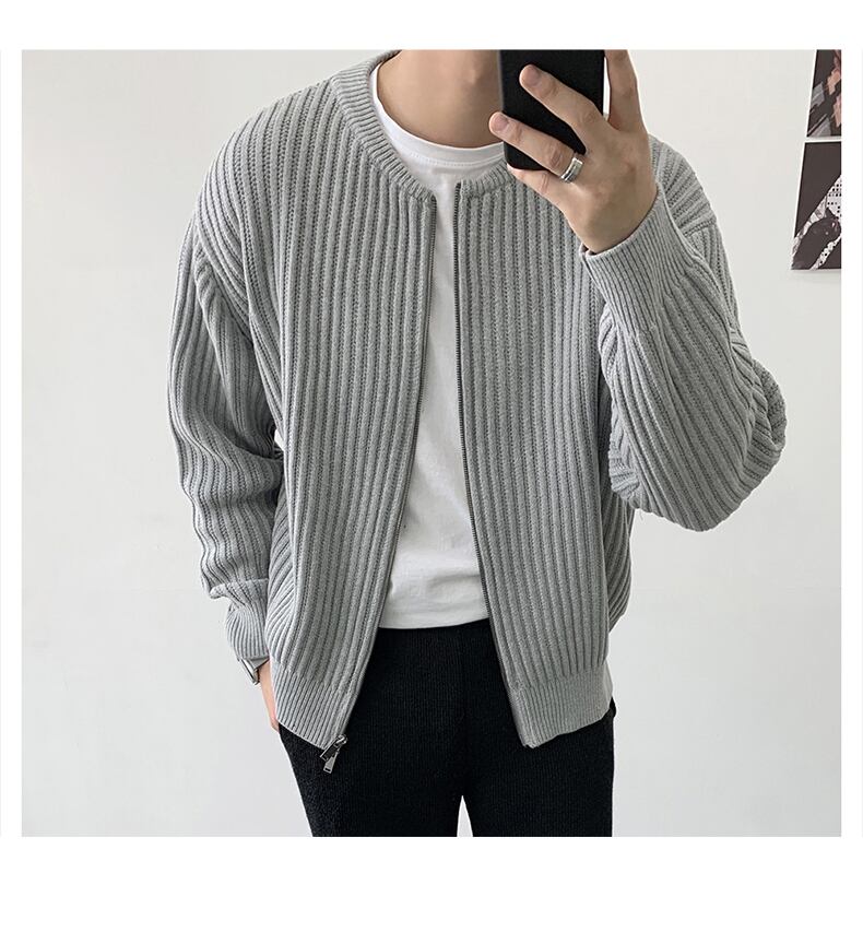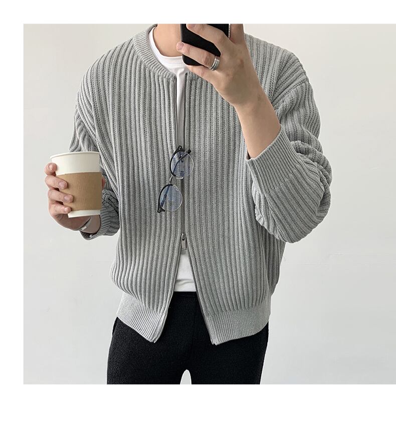 秋のラウンドネックジッパーセーターメンズルーズカジュアルセーターオールマッチトレンド無地ニットカーディガンコート オータム 秋物 Oネック ソリッドカラー BLUU83957650128