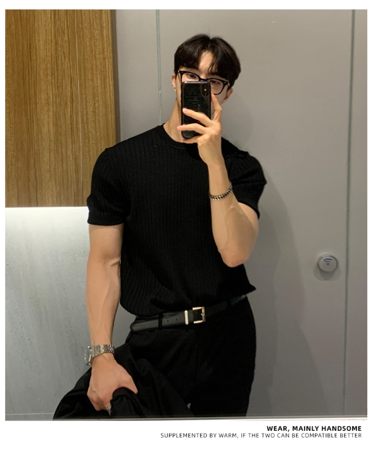 夏のトレンドカジュアルルーズラウンドネックTシャツ半袖メンズバージョンインレトロ無地オールマッチ通気性ニットトップス サマー 夏物 Oネック ソリッドカラー BLUU72188264678