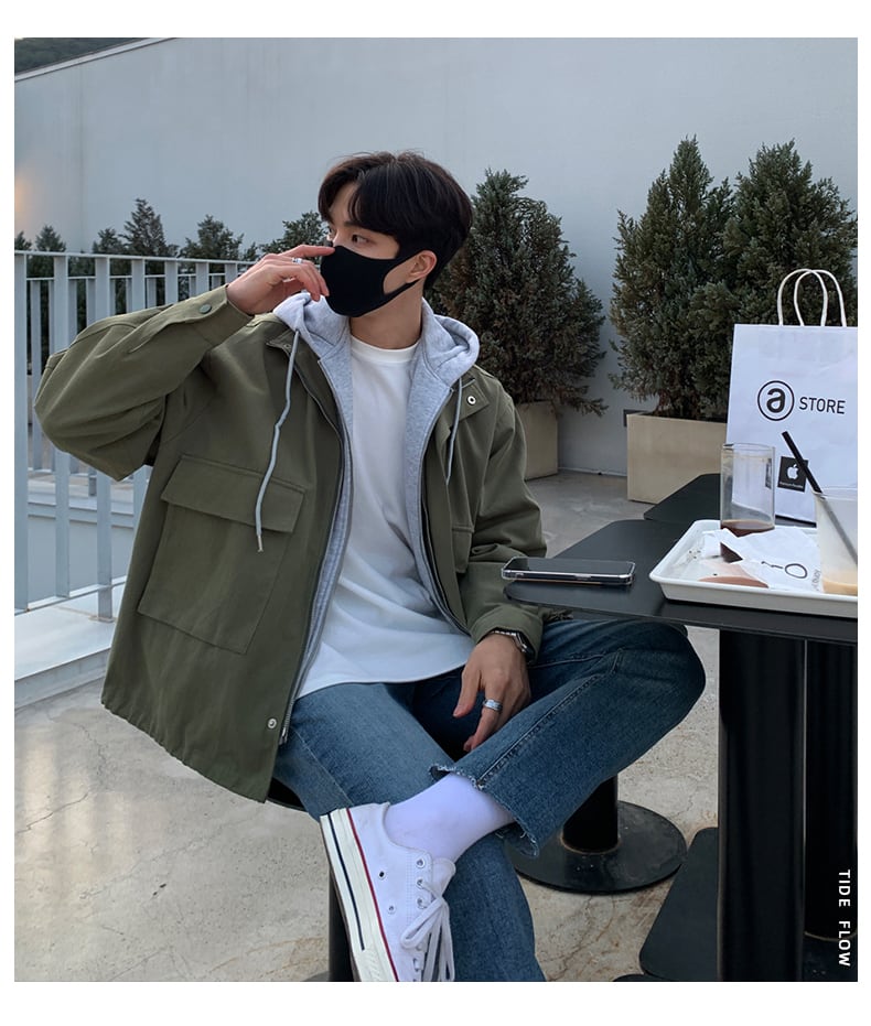 春のアーミーグリーンジャケットメンズタイドブランドルーズラペルステッチフード付きセーター香港スタイルレトロツーリングトップ スプリング 春物 BLUU20379718259