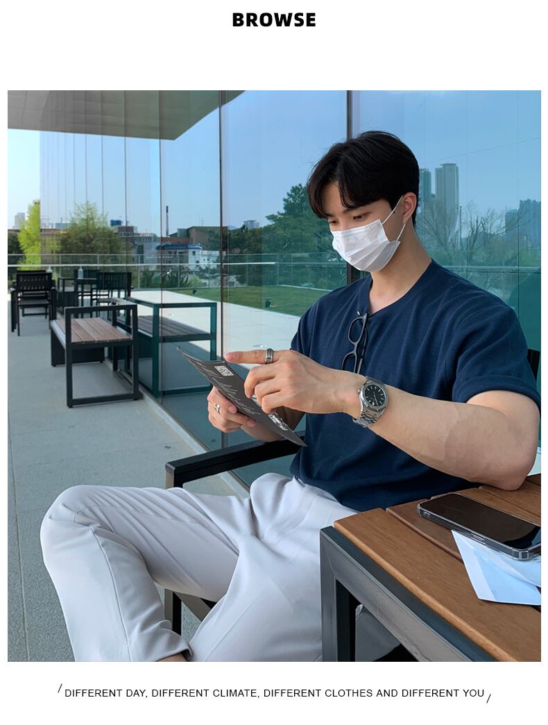半袖メンズサマーファッションブランド怠惰なルーズラウンドネックTシャツ香港スタイルのインレトロファッションオールマッチニットTシャツ 夏物 Oネック BLUU81484260534