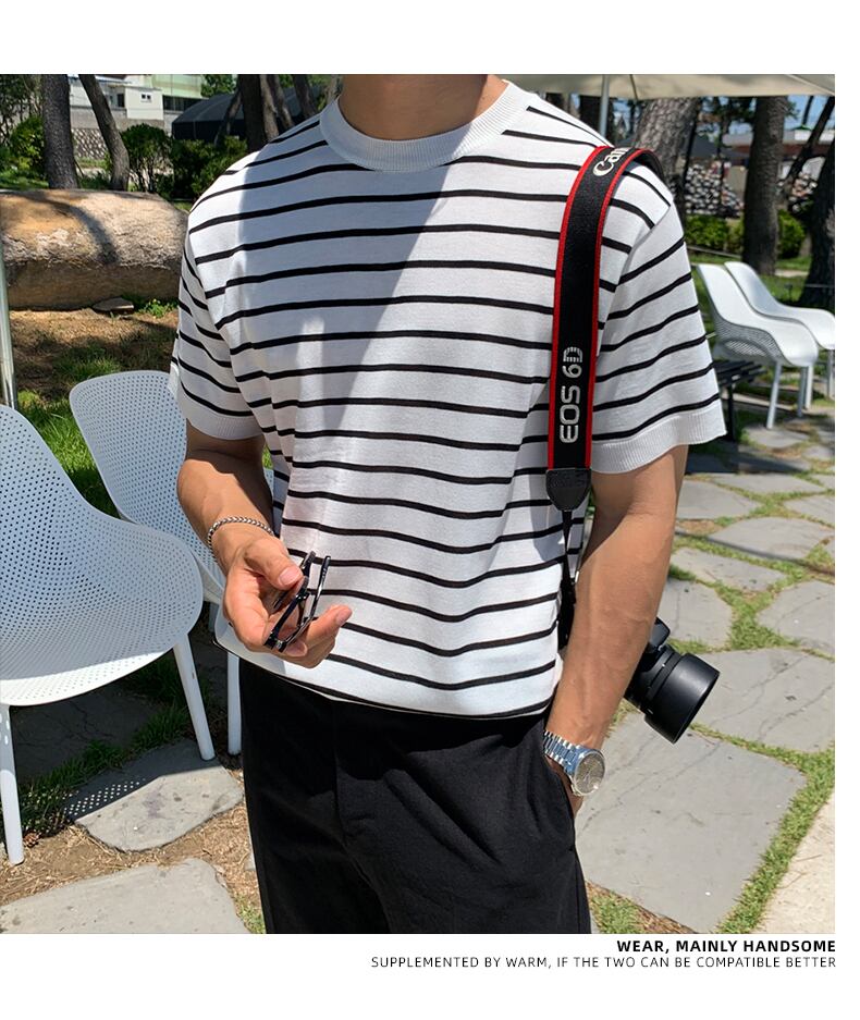 半袖メンズサマーカジュアルインストライプハーフスリーブトップトレンドスーパーファッションシンプルルーズシンニットTシャツ 夏物 BLUU38045710093