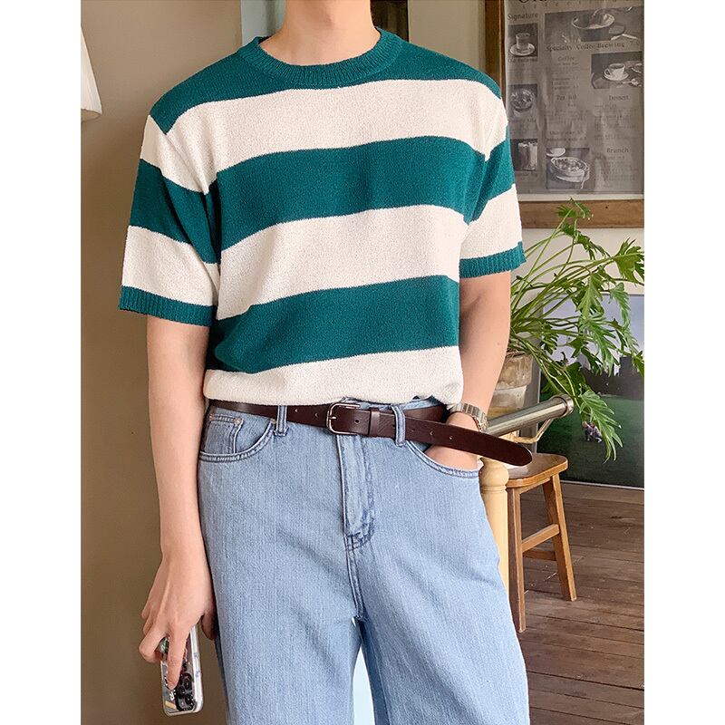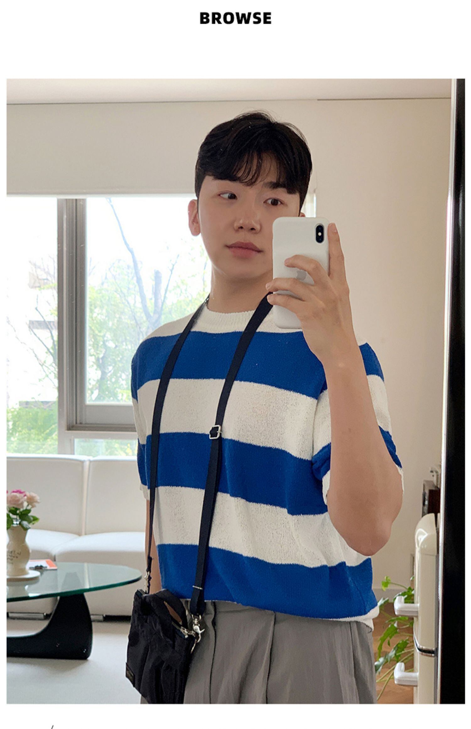 半袖Tシャツメンズインスティッドブランドニッチデザインストライプトップサマー怠惰なカジュアルファッションニットTシャツ 夏物 BLUU78307465071