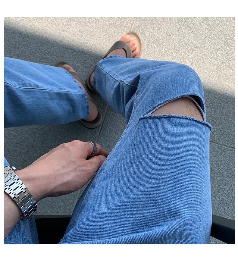 破れたジーンズメンズサマーインパーソナリティデザインルーズパンツトレンディなファッションオールマッチ無地パンツ 夏物 ソリッドカラー BLUU48272807767
