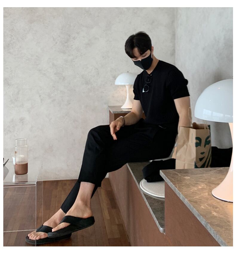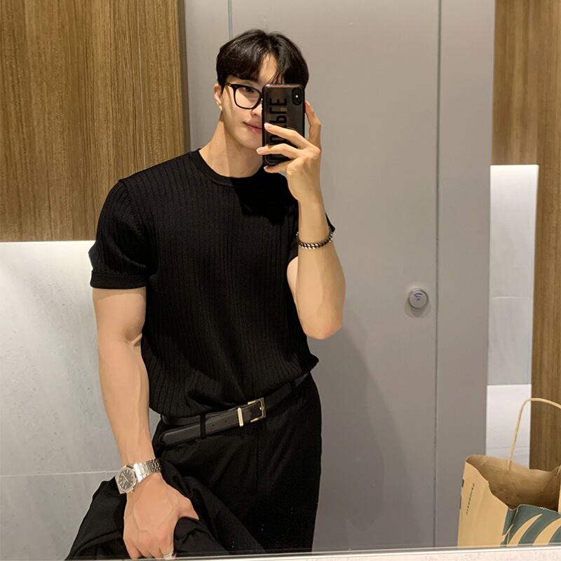 2022年半袖メンズルーズイントレンドオールマッチタイドブランド香港スタイルインレトロニットTシャツサマーカジュアルトップ 夏物 BLUU36539110524