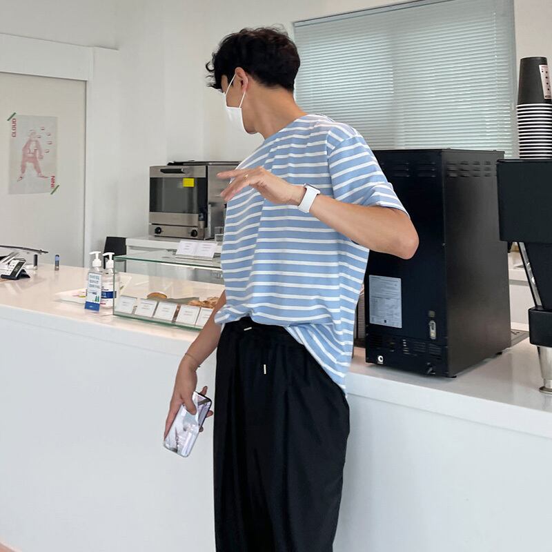 メンズ半袖2022夏新作ルーズファッションハンサムTシャツタイドブランドインニッチデザインストライプTシャツ サマー 夏物 BLUU95626758382