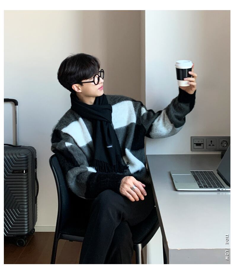 セーター新 2022 人気メンズニッチステッチコントラストカラーチェック柄セーター秋潮ブランドカジュアルジャケットトップ オータム 秋物 BLUU78693061063