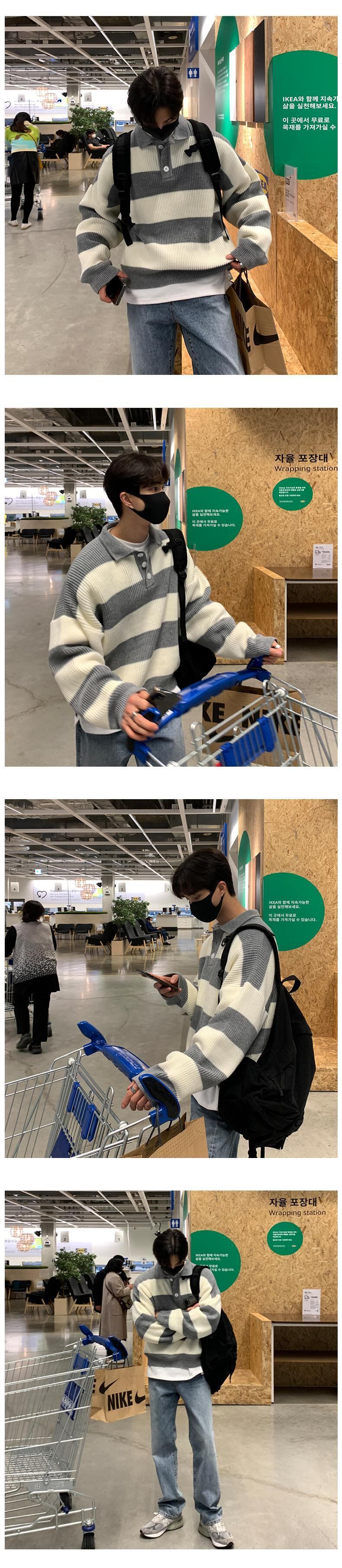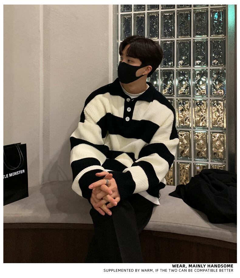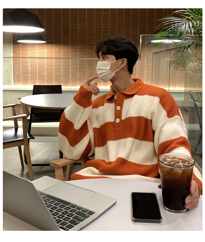 ストライプ セーター メンズ ハイエンド ルーズ レトロ ese 怠惰な潮ブランド ラペル セーター カジュアル ジャケット BLUU12532458384