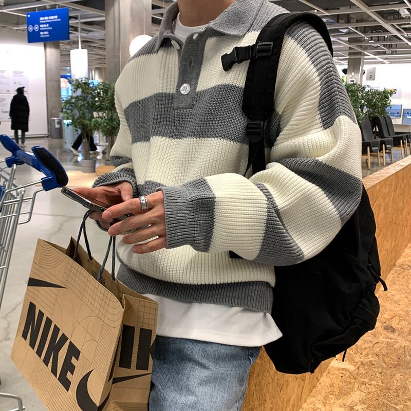 ポロカラーセーターメンズニッチハイエンドオールマッチストライプセーター秋冬イントレンドカジュアルジャケット オータム 秋物 ウィンター 冬物 BLUU90501058191